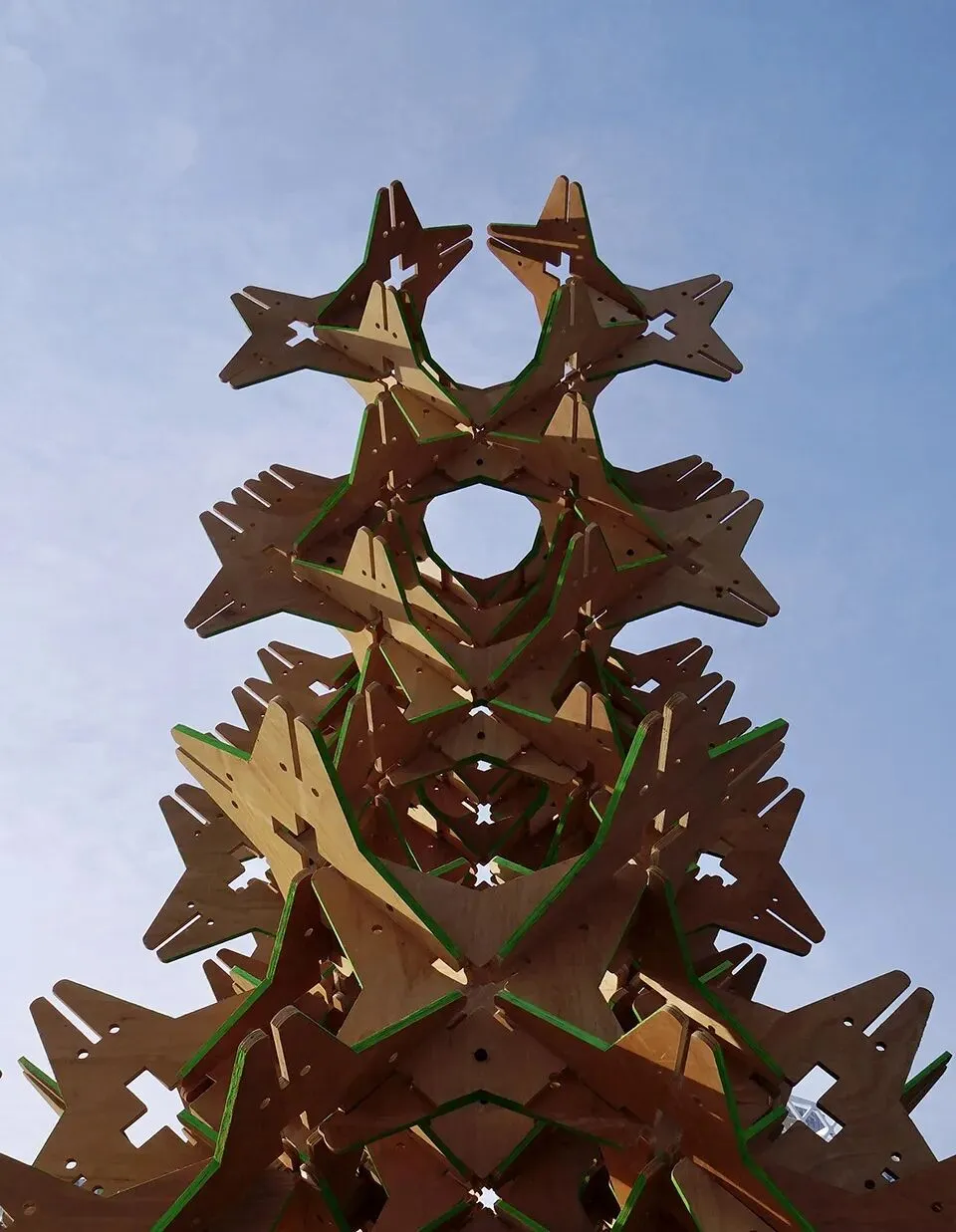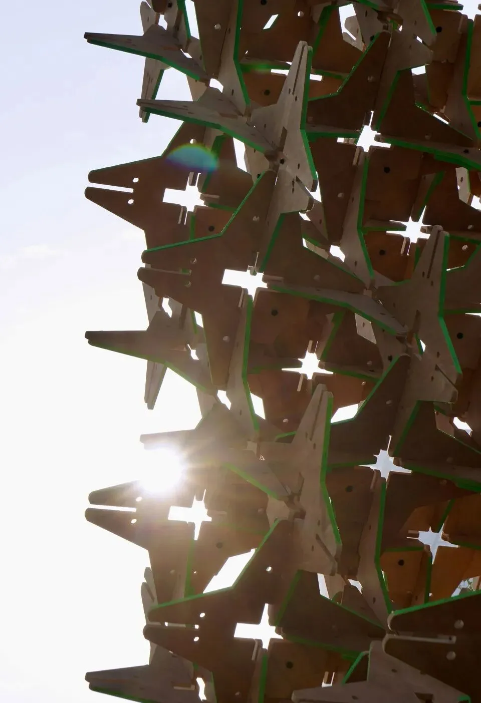 装置由七百余枚星型单元构成,这些单元采用环保板材切割成型,通过创新的榫卯咬合方式相互嵌接,形成自承重的稳定结构。艺术家从东方传统榫卯中提炼出“以扣合代替连接件”的逻辑,将其运用于多角度、多方向的单元组合中,使每一枚星体既是独立的形态单元,也是整体结构的力学节点。单元之间互为支撑、层层攀升,最终聚合成一座拔地而起的塔状构筑。其形态在垂直方向上呈现出由密到疏、由实到虚的渐变,暗示着生长与节律。