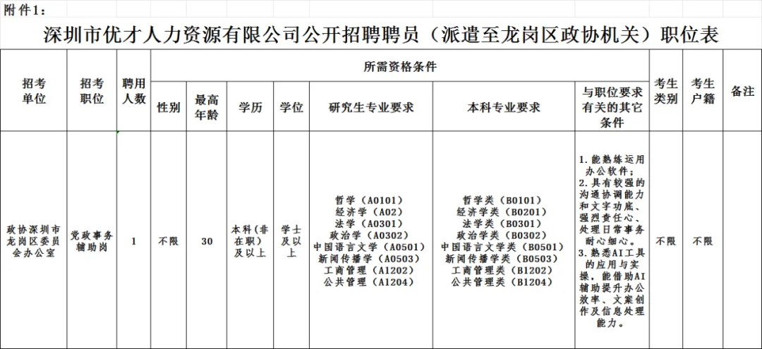 1.深圳市优才人力资源有限公司公开招聘聘员(派遣至龙岗区政协机关)职位表