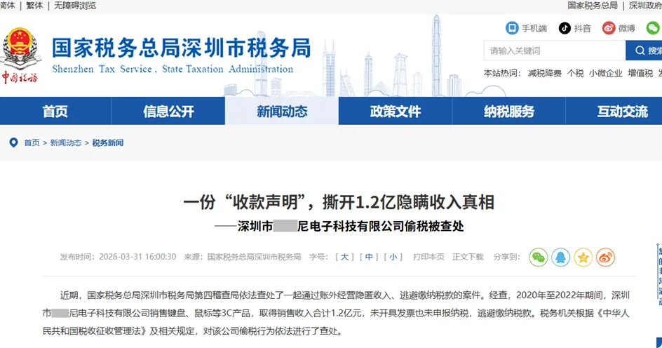 最近,深圳一家老牌3C企业的税务稽查案在圈内炸开了锅——“某某尼”电子科技,这家经营了二十年的键盘鼠标厂商,因为一份《收款信息申明》露出了马脚,最终被查出通过私人账户隐匿1.2亿元销售收入,补税加罚款超过2800万元,老板还可能面临刑事责任。