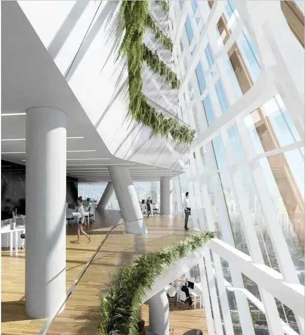 内部有大堂、科研办公、空中展厅、数据机房及科研实验室等多种功能空间。主入口和VIP落客直接通向气势磅礴的三层通高大堂门厅,员工和访客通过安检闸机后,可乘坐分区电梯到达目的楼层。内部设有多个中庭,连接不同楼层,促进员工互动与合作,鼓励跨部门交流,提升创新效率。中庭还整合了植被,用于过滤空气污染物,改善室内空气质量和舒适度。空中花园与幕墙上的绿植空间相结合,是供员工放松和交流的高层空间,也可兼作接待区和活动空间,为建筑增添了灵活性和多功能性。