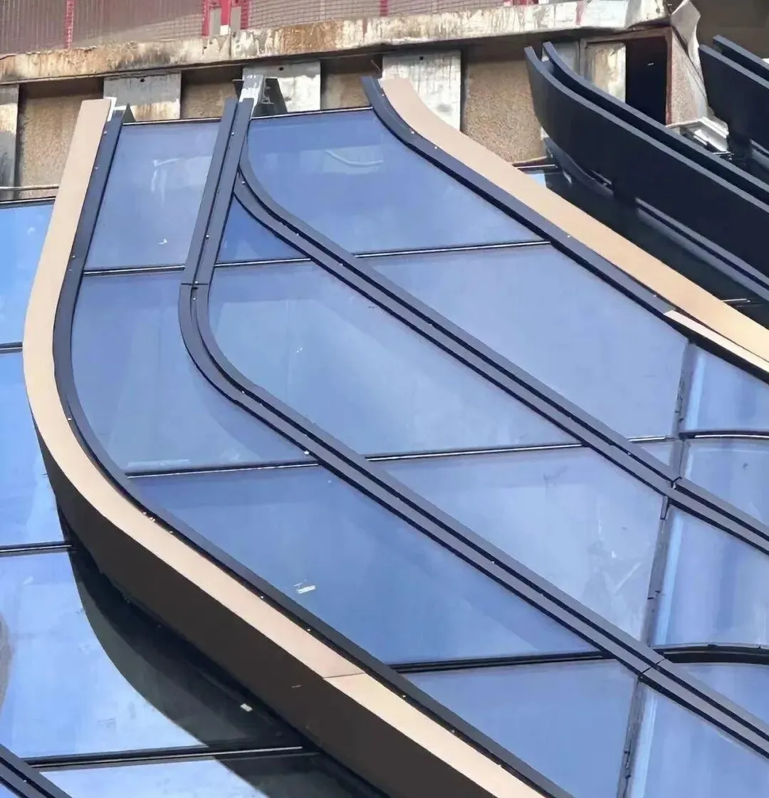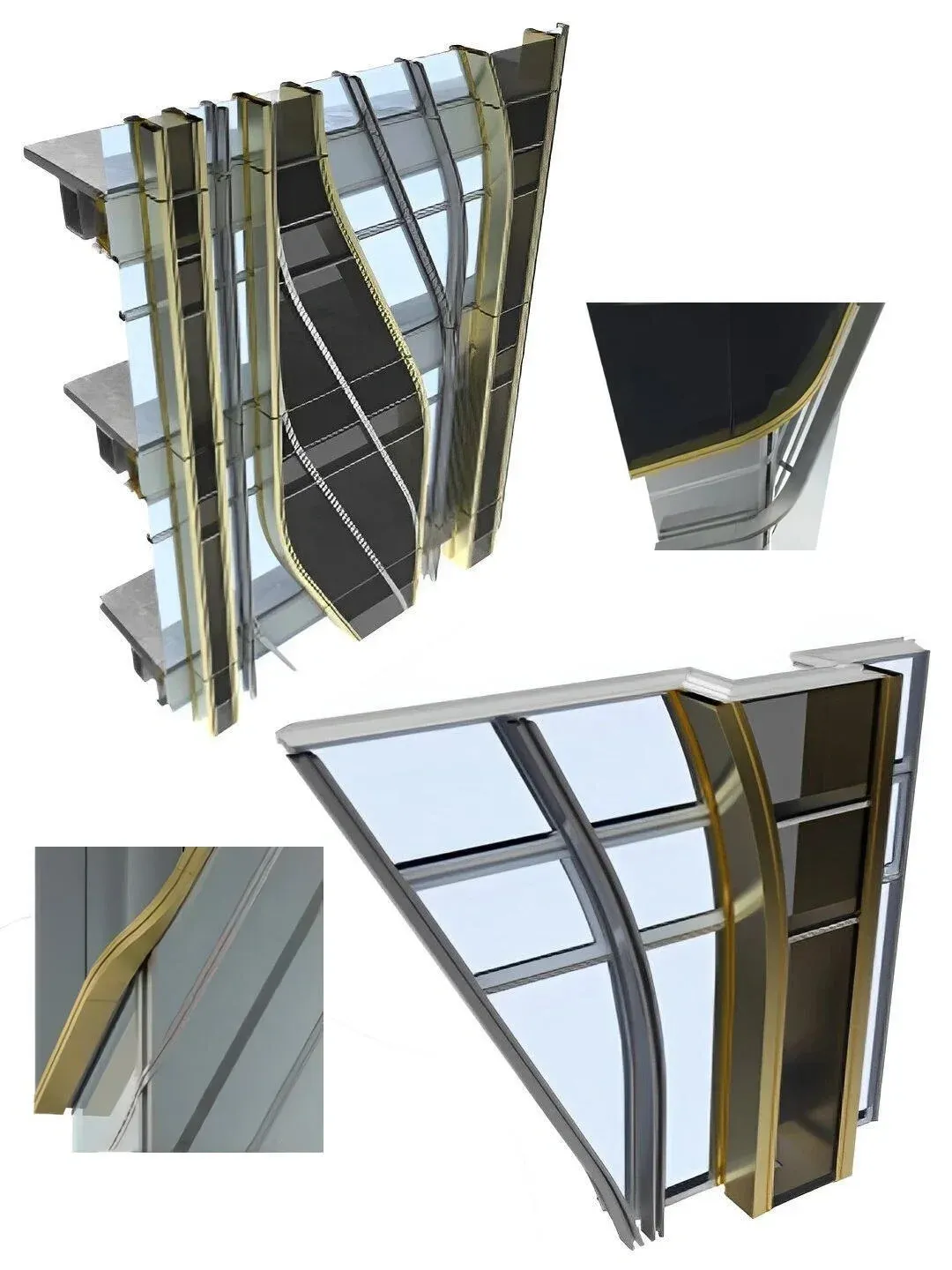 项目周边建筑密集,与邻近住宅楼最短距离仅约4米。设计通过精确退台与切割,减少对周边建筑日照影响,同时在高密度城区营造流动感的城市界面。立面系统采用深灰色低反射玻璃与高透中反射玻璃交错组合,搭配古铜色/黑色垂直与倾斜玻璃竖梃,形成渐变透明度与色彩变化;高性能隔热材料+自遮阳外鳍片,优化太阳辐射控制。内部无柱大空间实验室、空中展厅、数据机房等,强调科技感与功能高效性。立面设计经过阳光直射精细分析,结合BIM技术实现高效施工与低能耗。整体造型既具未来科幻感,又高度实用,成为福田CBD新地标。