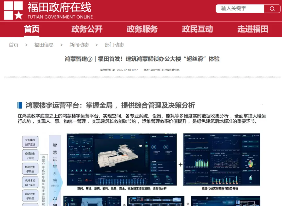 2026年2月,福田区住房和建设局以深圳金融科技研究院大厦鸿蒙智慧改造为试点,率先打造全市住建领域鸿蒙技术应用标杆项目。通过鸿蒙分布式技术,实现了照明、空调、电梯、会议设备等的“万物互联”,筑牢了自主可控的信息安全底座。改造后,运维效率提升20%以上、能耗降低20%以上、设备使用寿命延长3—5年,整体运营成本降低约25%,为全市商办楼宇绿色低碳转型提供了鲜活范例。