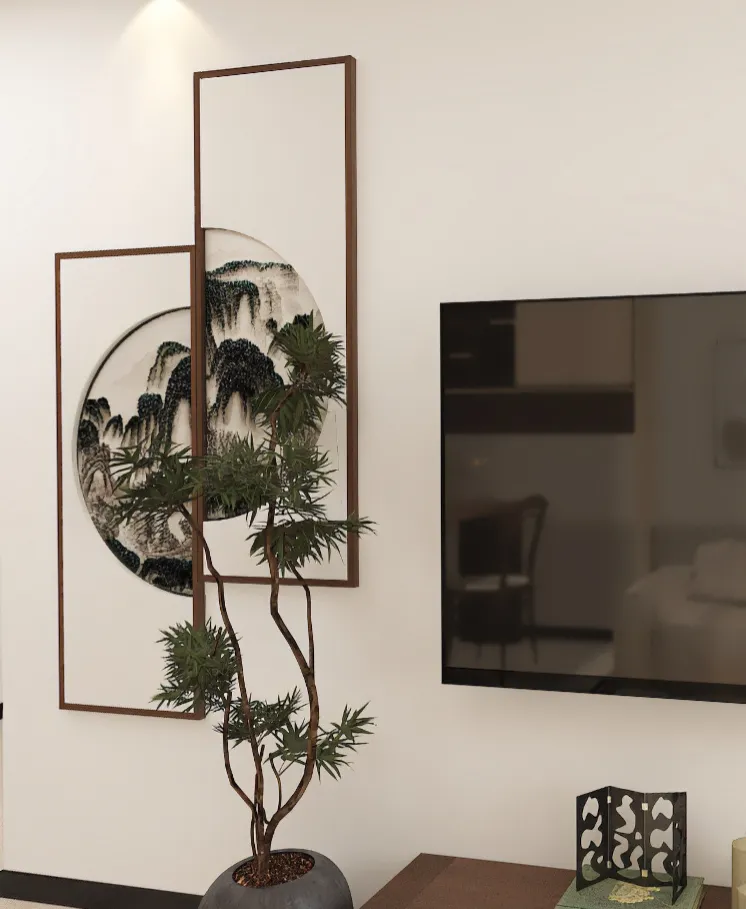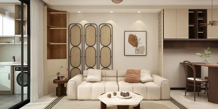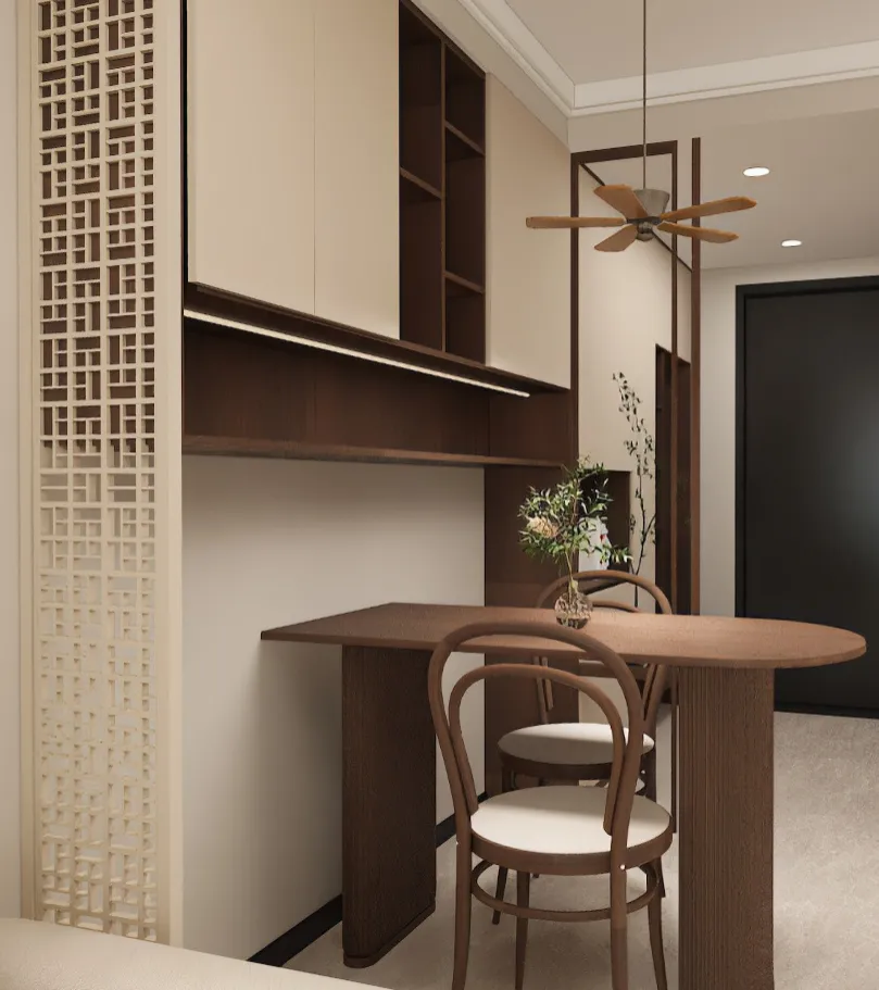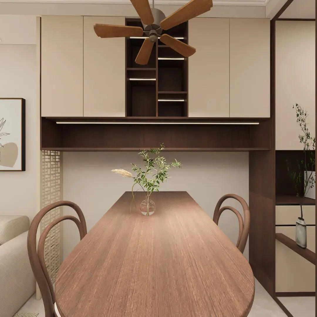 空间叙事围绕“融合”展开:客厅的L型沙发、木质吊扇与抽象画,奠定了放松氛围;餐厅区域的圆形餐桌兼具用餐与工作功能,墙面上“画室”字样与中式山水画点明主人身份与东西方美学的交融。定制深浅收纳柜在满足海量储物的同时,其体块本身也成为装饰。阳台家务区被巧妙集约隐藏,一本《CHANEL》书籍不经意间流露品味。整个空间在功能、美感与个人情感间达成了精妙平衡,成为一个历久弥新的归心之所。
