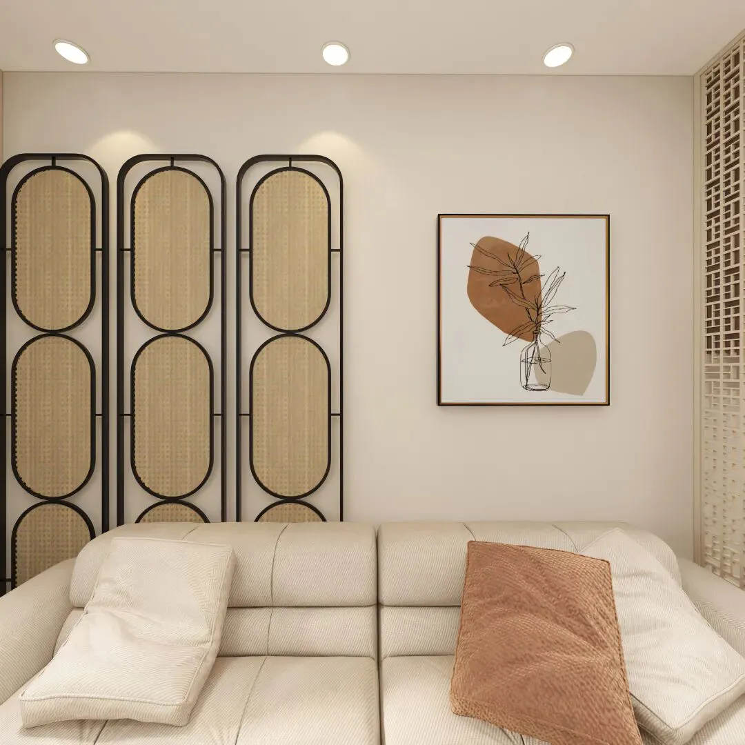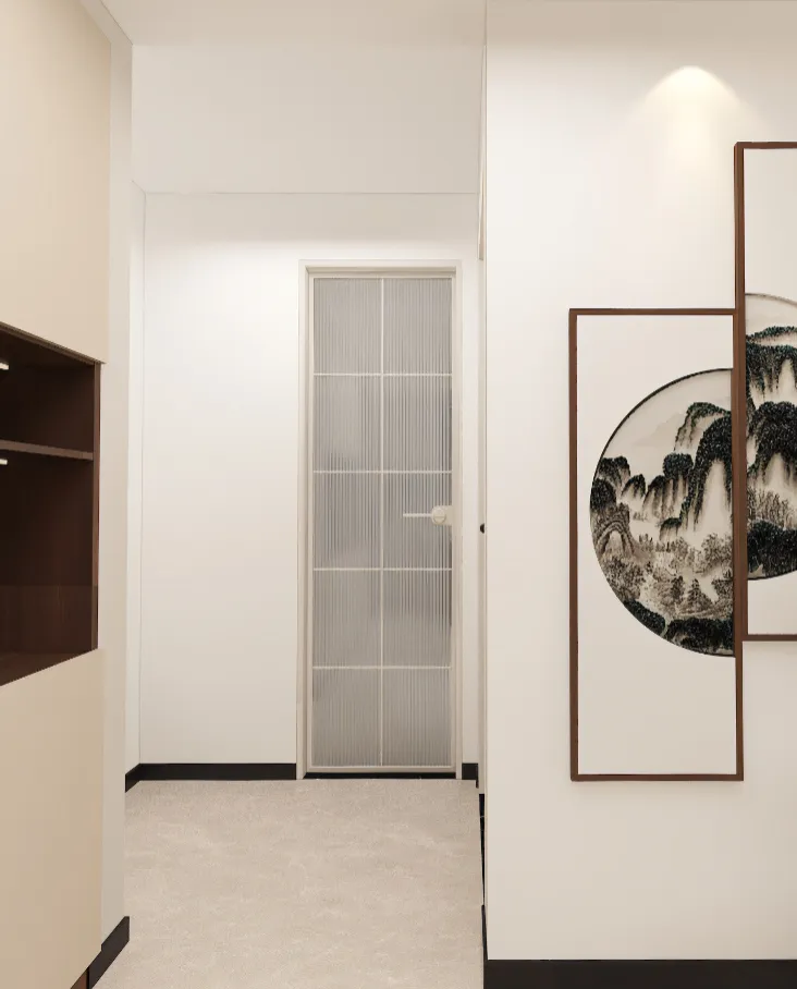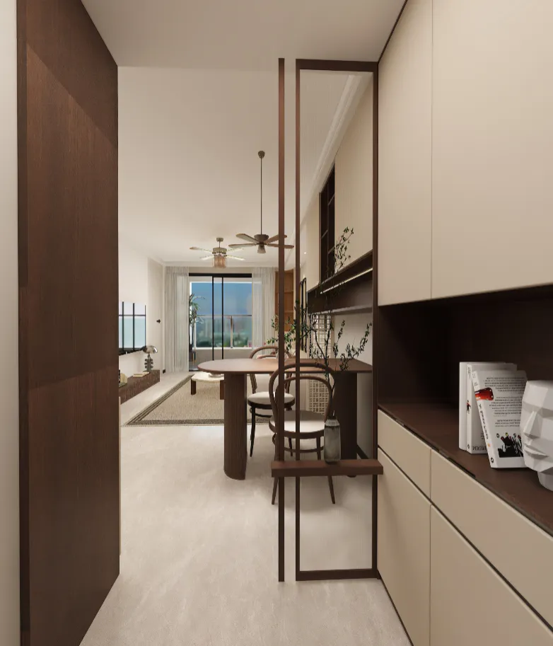 定制储物柜采用了经典的米白与深棕撞色设计,封闭柜门确保收纳的整洁,开放层板则成为展示收藏与书籍的舞台。最巧妙的是深棕色木质格栅屏风的运用,它并非生硬的隔断,而是一道“呼吸的墙”,既明确了玄关的领域感,又让后方起居空间的光线与景致若隐若现,形成视觉吸引。