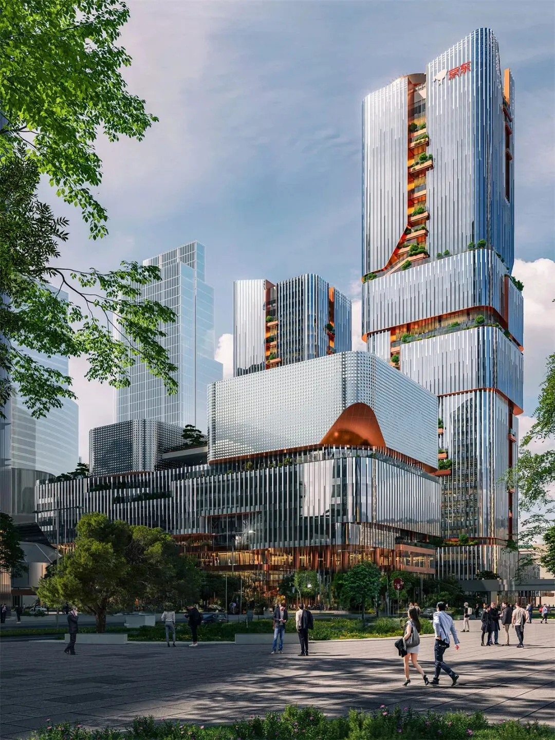 塔楼幕墙设计巧妙融入瀑布意境,竖向百叶窗通过调节玻璃的反射率和透明度,模拟水流视觉效果,既保障通风效果,又呼应深圳山水的自然特色。沿城脊而建的“京东中心”幕墙宛如抽象山景画卷,顶部设有向公众开放的剧场和展览空间,成为城市文化地标。