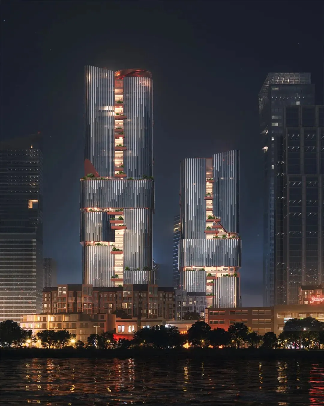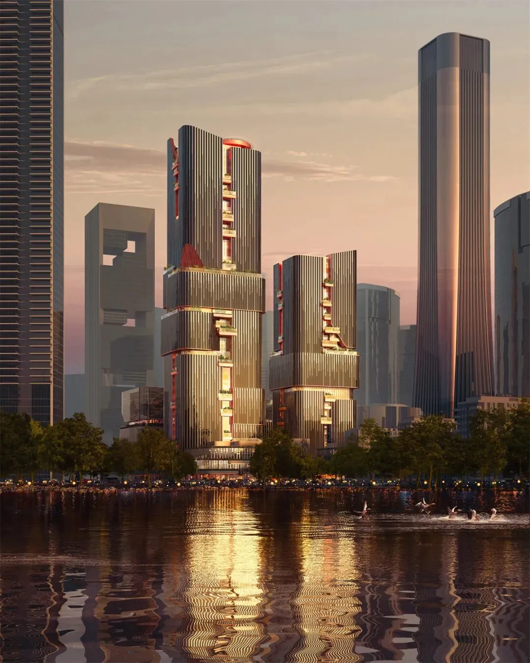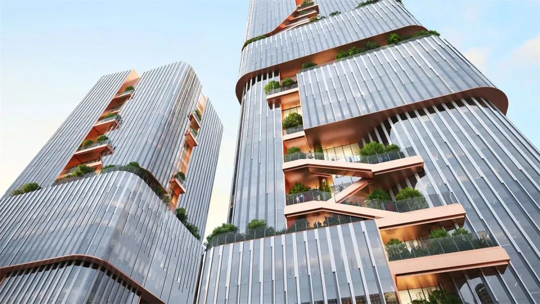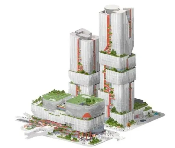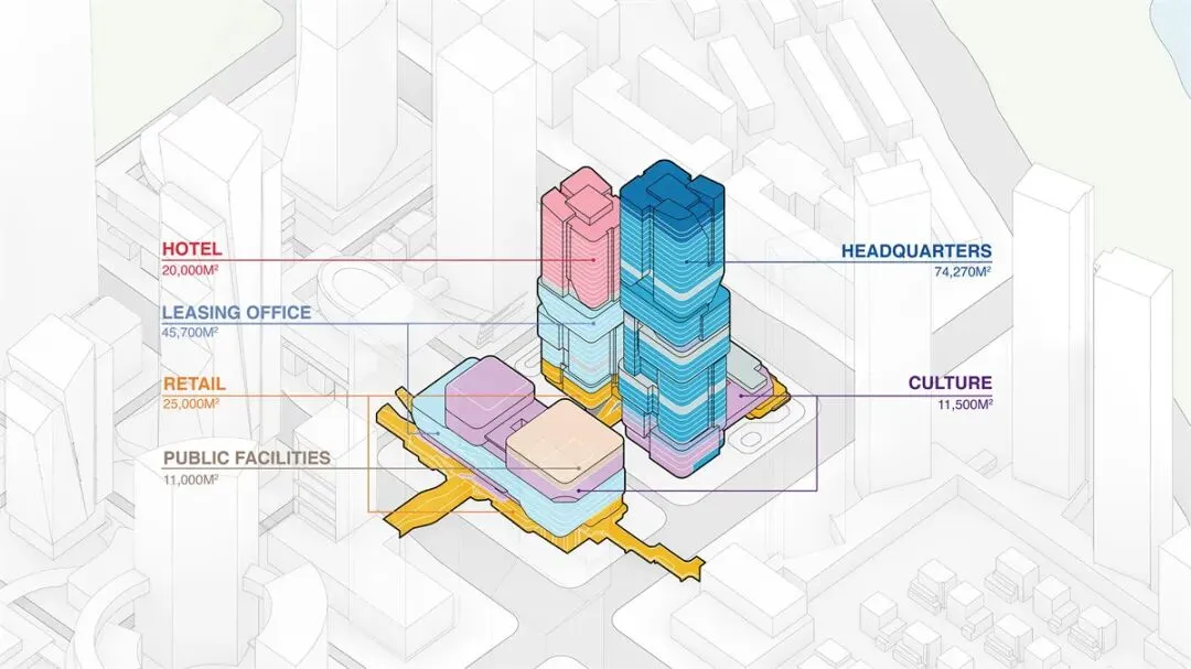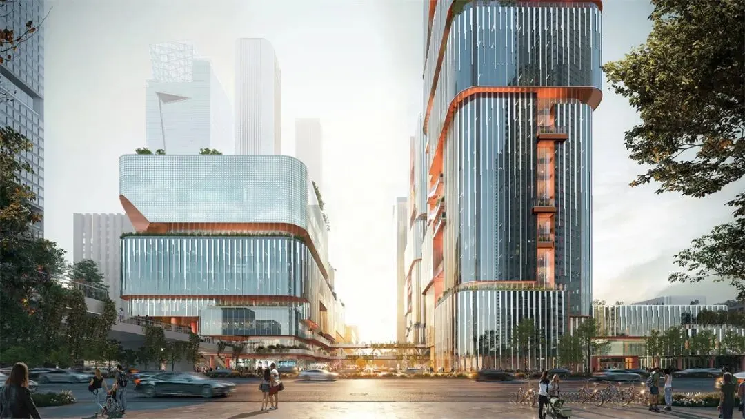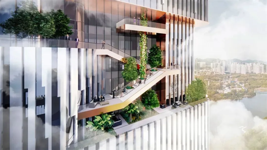 项目由国际知名建筑师奥雷·舍人(Ole Scheeren)设计,以“画境之城”为核心理念,通过水平与竖向的空间渗透手法,将自然元素与现代化办公功能有机融合。建筑群由两栋超高层塔楼、一栋商业办公楼及地下建筑组成,整体形态与周边山地景观的自然脉络相契合,形成“居间空间”的社交中轴线。