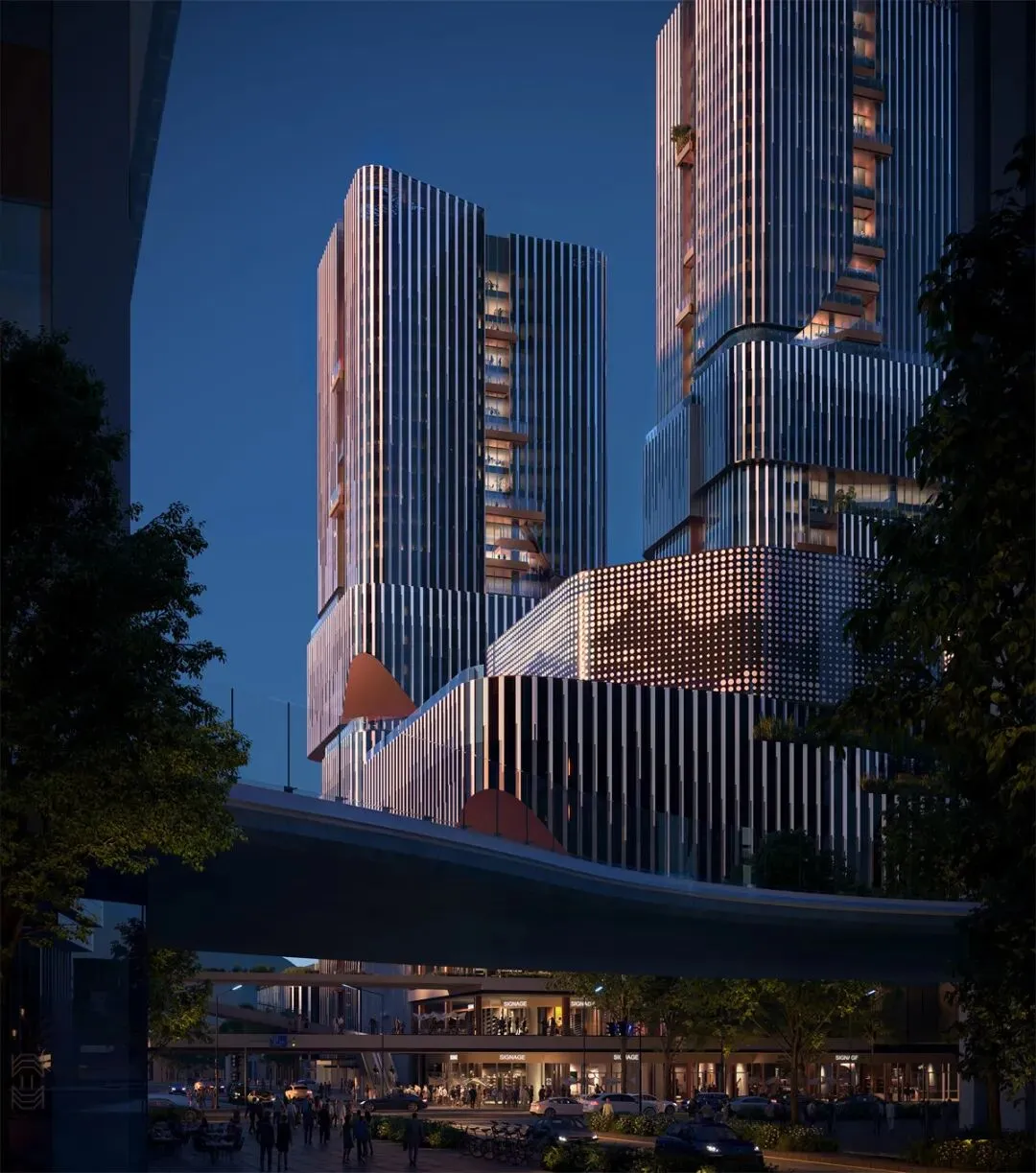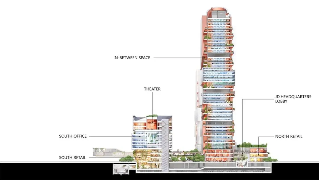 项目通过“居间空间”设计,将建筑之间的开放区域打造为社交枢纽。蜿蜒的开放式轨迹贯穿整个建筑群,形成连续的公共绿色长廊,并通过植物种植和自然通风设计,抵御烈日与暴雨,营造宜人的户外交流环境。裙楼中的“京东世界”提供临街文化活动空间,与地面延伸至屋顶的“中央公园”形成互动生态系统。