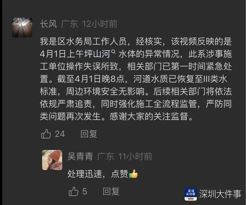 当晚,有自称是坪山区水务局工作人员在媒体评论区留言回应:经核查,4 月 1 日上午坪山河水体异常,系涉事施工单位操作失误引发。相关部门第一时间紧急处置,截至当晚 8 时,河道水质已恢复至 Ⅲ 类标准,周边环境安全无虞。后续将依法依规严肃追责,强化施工全流程监管,严防此类问题复发,感谢公众关注与监督。