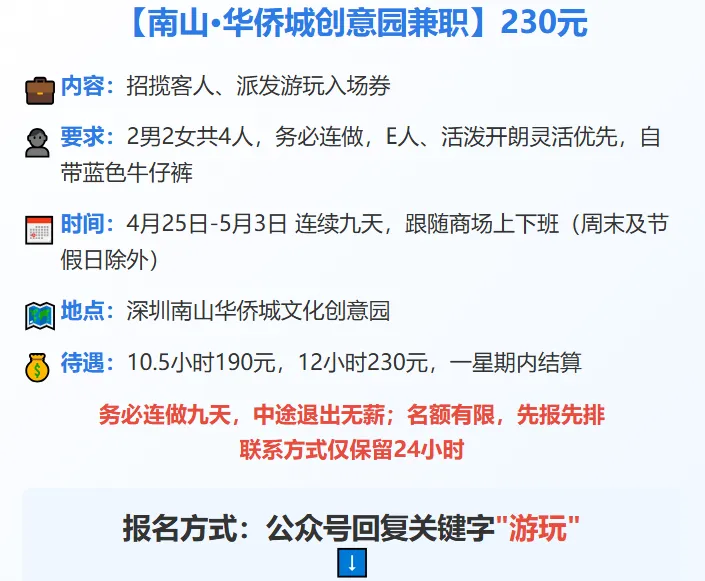 >【深圳兼职】南山·华侨城创意园兼职丨230元,招揽客人、派发游玩入场券,男女各需要两名,跟随商场上下班(周末及节假日除外)
