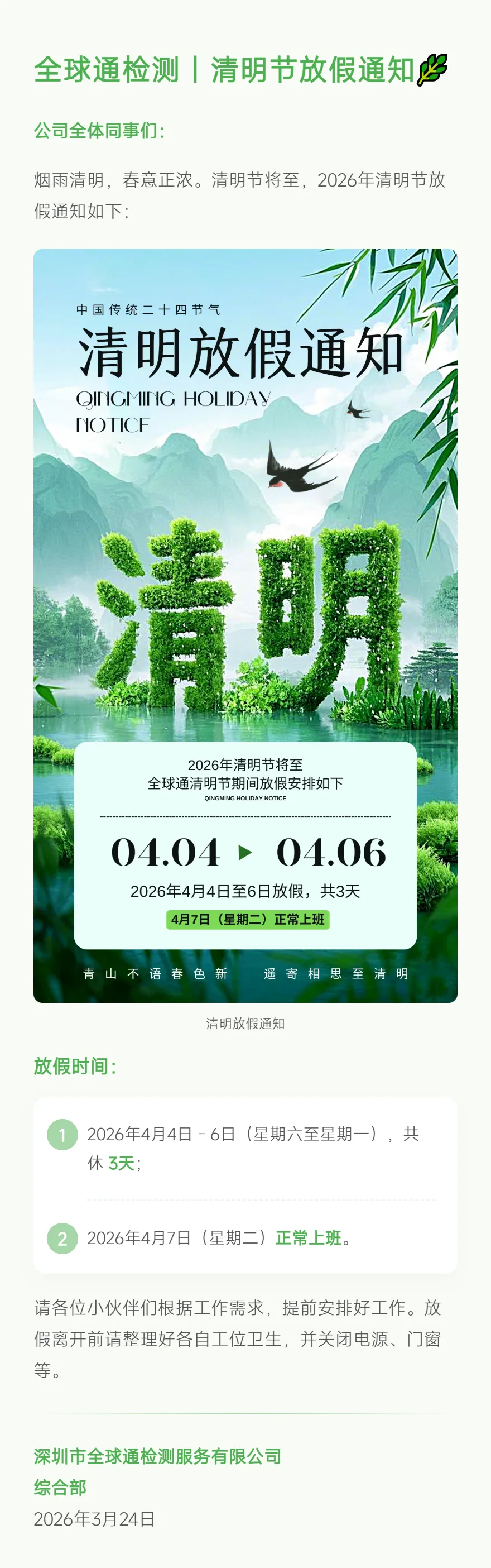 全球通检测五一放假通知