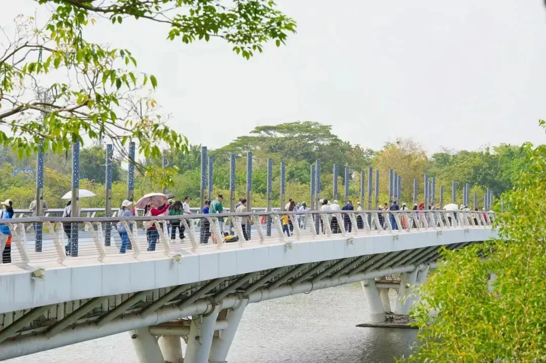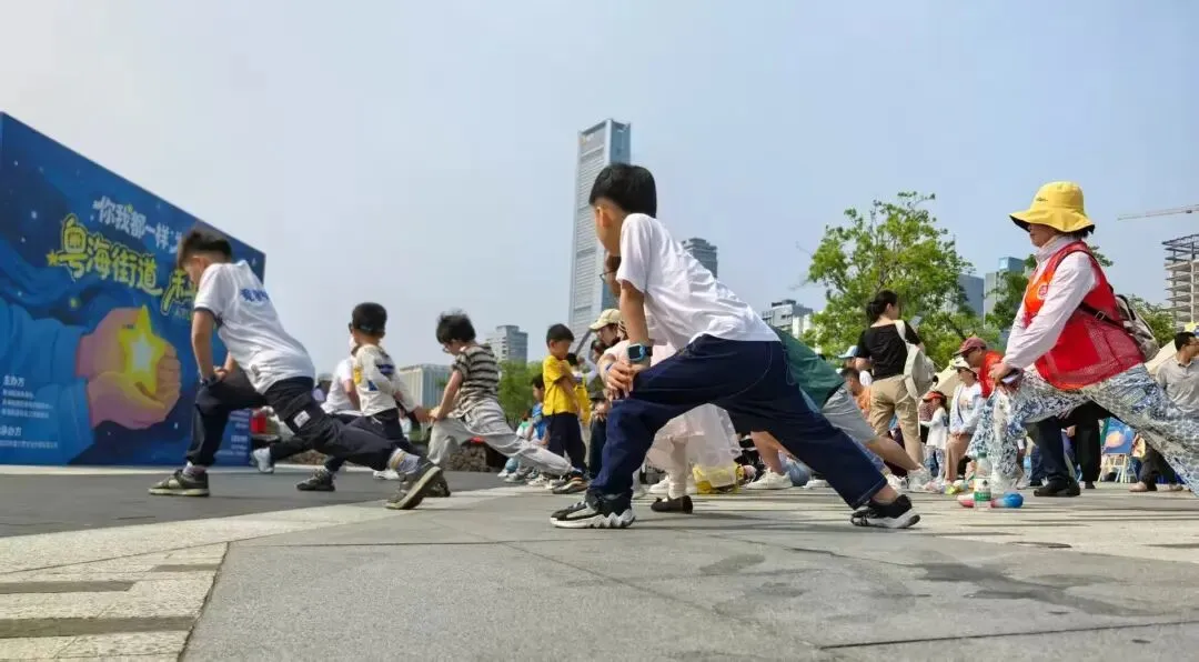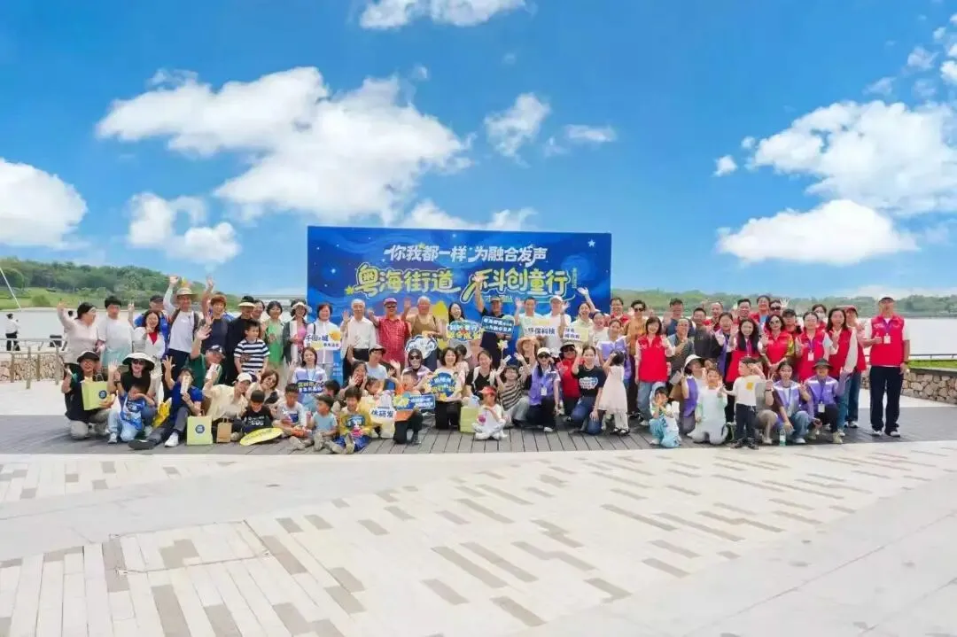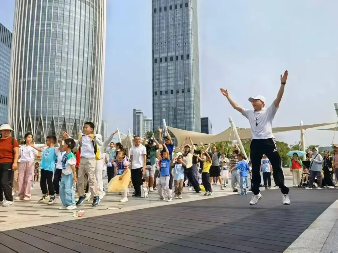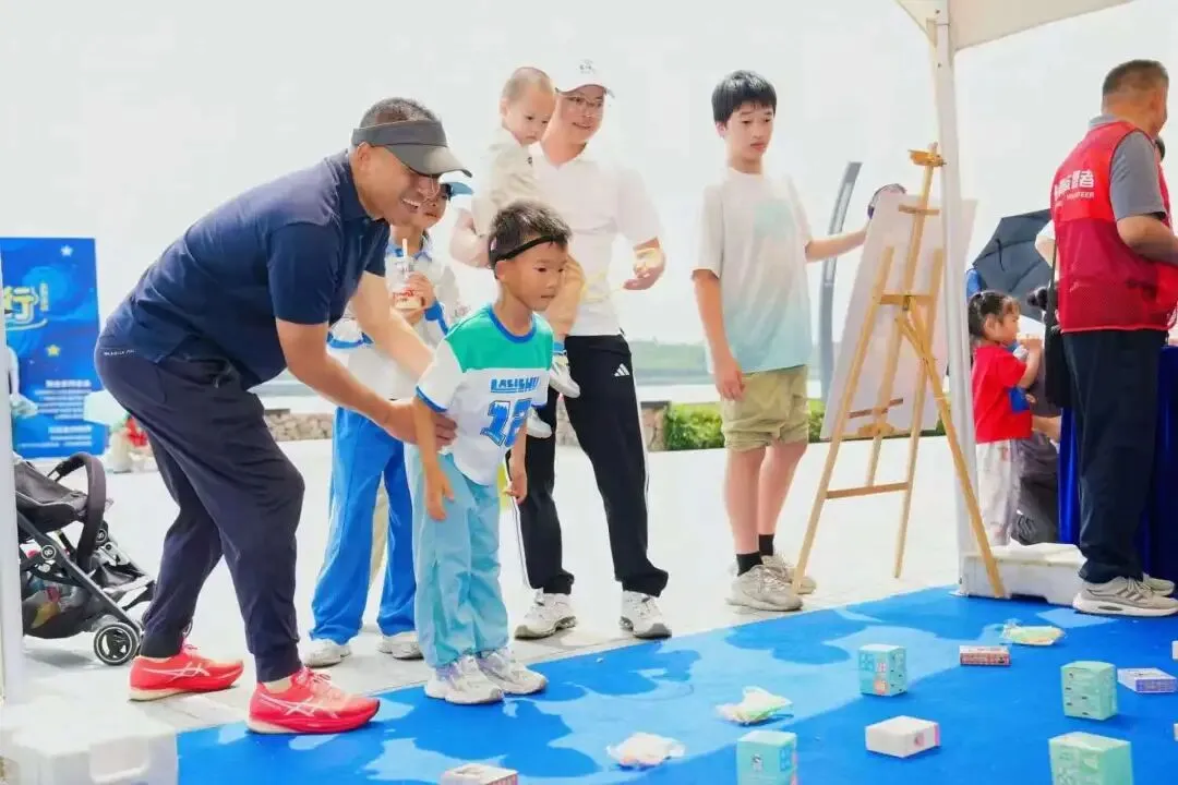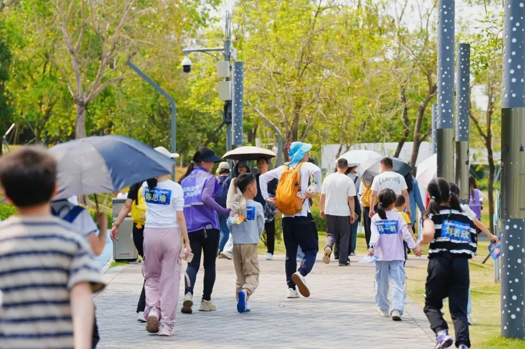 活动当天,孩子们手拉手组成小队,沿湖畔步道缓缓前行,沿途经过星光大道、春笋、潮汐广场、水秀栈道,大家边走边拍照、欢声笑语不断。跑在前方的孩子主动回头呼朋引伴,也会耐心地等着步伐稍慢的伙伴。一个活泼的孩子自然而然地伸出手,牵住了身边略显局促的同伴;那个被牵住的孩子,肩膀先是微微一缩,愣了半秒,随即嘴角咧开一个大大的笑容,两只小手就这样紧紧攥在了一起。那些平时不太敢往人群里凑的孩子,今天也大大方方地跑着、笑着;特殊儿童的家长也终于可以安安心心地陪孩子玩,像所有普通的家长一样。