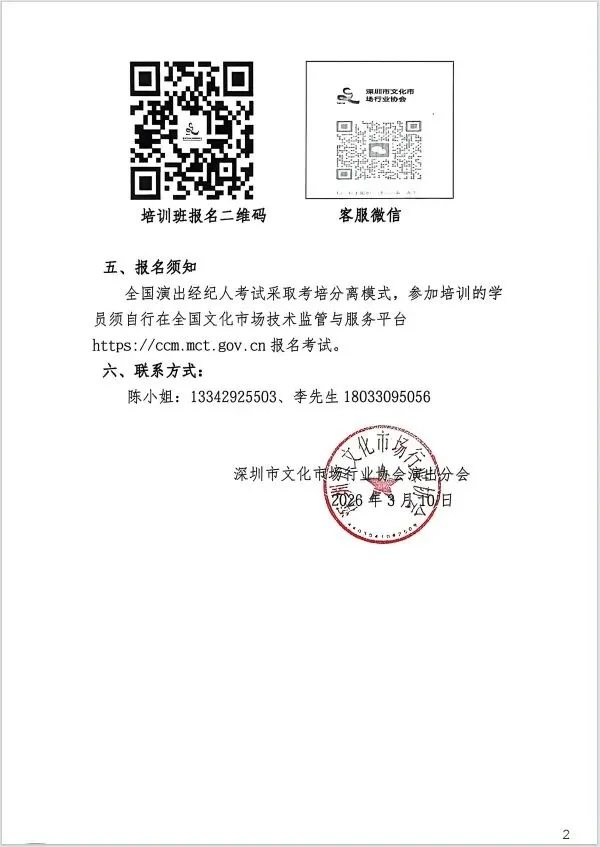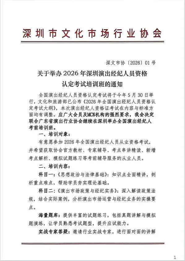 全国演出经纪人员资格认定考试将于今年5月30日举行,文化和旅游部已公布《2026年全国演出经纪人员资格认定考试大纲》,本次演出经纪人资格证考试在内容与标准方面均有调整。应广大会员及MCN机构的强烈要求,我会决定联合广东省演出行业协会继续在深圳举办全国演出经纪人考前培训班。