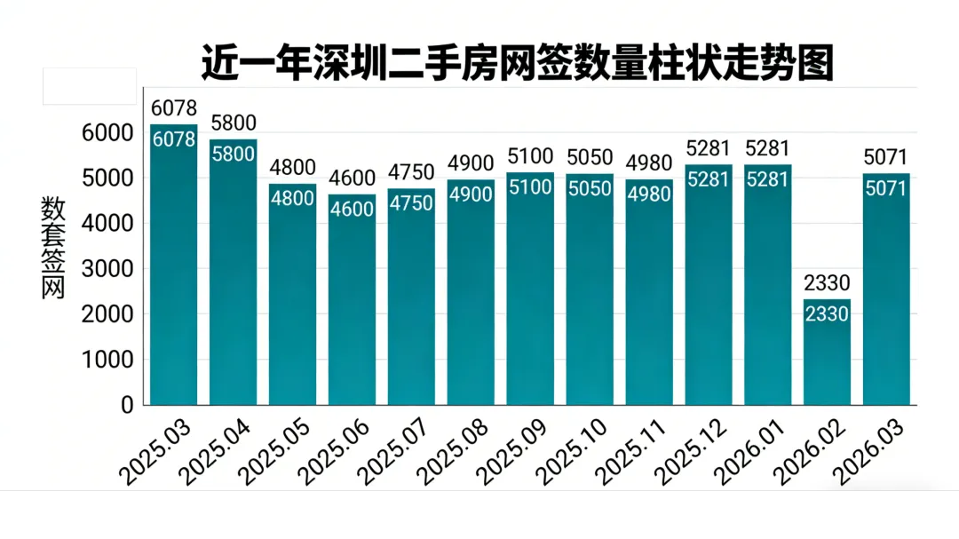 2026 年 3 月,深圳二手房全月网签5071 套,环比涨 117%、同比降 16%.