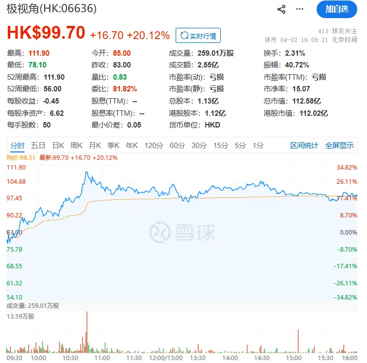 极视角(06636.HK)上市首日(4 月 2 日)股价表现亮眼:收盘报 99.70 港元,较昨收价 83 港元大涨 20.12%,港股市值达 112.02 亿港元。
