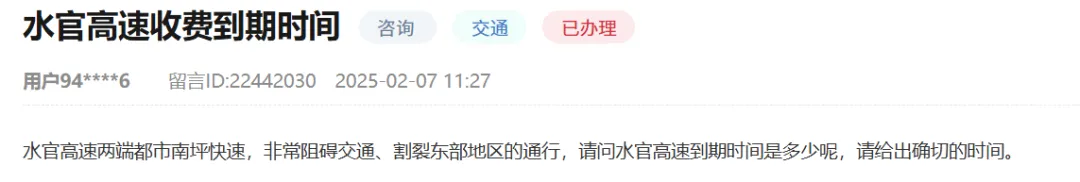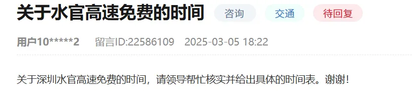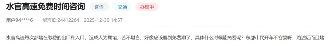 奥一新闻记者梳理发现,仅2025年12月,即有两位市民在人民网“领导留言板”留言询问水官高速取消收费的具体时间。相关留言虽获部门电话回复,但结果并未公开。