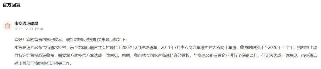 最近的一次官方信息发布于2023年12月31日,市交通运输局在公开回复中明确表示,水官高速将于2026年上半年取消收费。