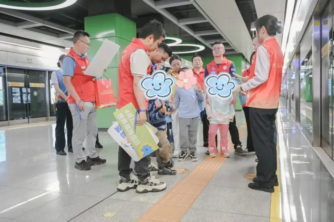 同时,志愿者们向过往乘客发放科普宣传资料,赠送蓝丝带与主题文创贴纸,广泛宣传孤独症相关知识,积极倡导社会各界关注孤独症群体出行需求,呼吁共同营造安全、包容、友善的无障碍出行环境。
