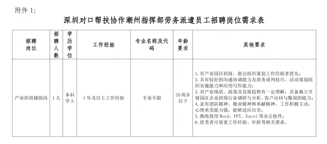 详见附件1《深圳对口帮扶协作潮州指挥部劳务派遣员工招聘岗位需求表》