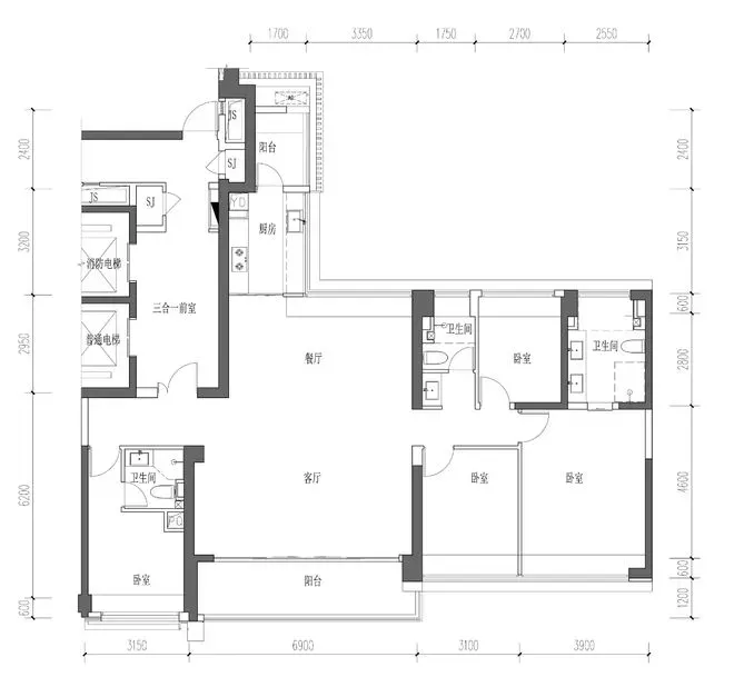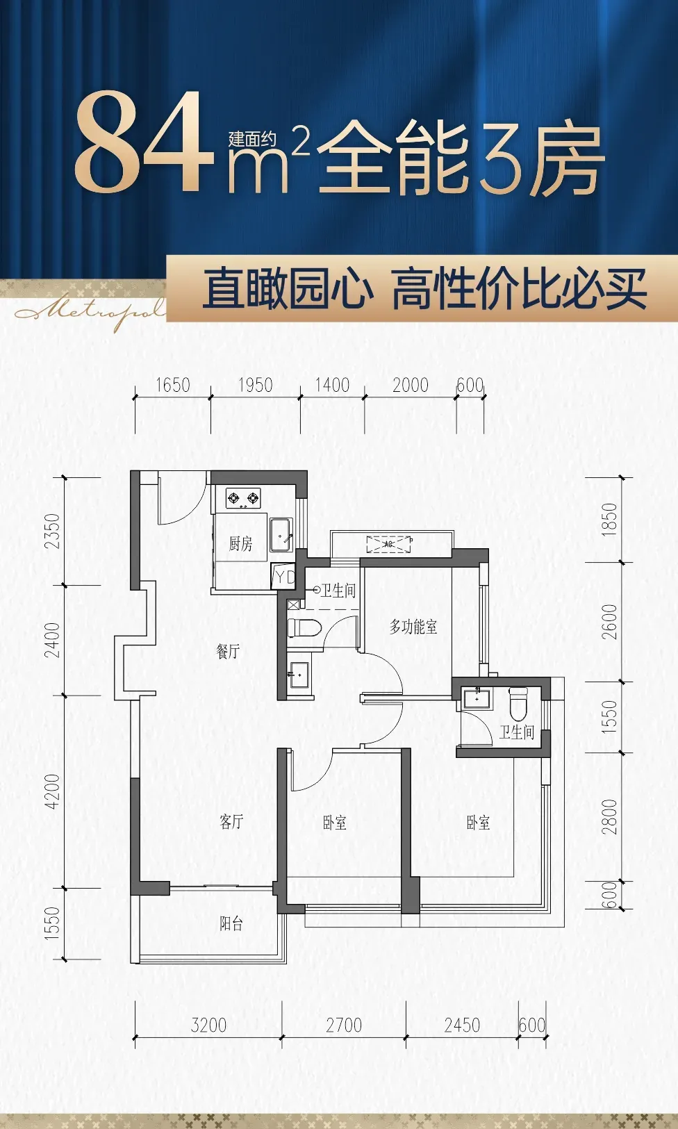,设计的是经典竖厅格局,客厅3.2米开间,LDKB一体化,S墙设计预留冰箱卡槽位,三开间朝南,3个卧室分别做到了主卧12.37㎡/次卧9.18㎡/次卧6.76㎡(包含墙体飘窗),U型厨房,卫生间三段式分离,得房率约77%(不含赠送),西南或东南朝向。