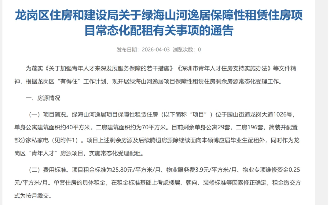 刚刚龙岗住建局公布,绿海山河保租房开始常态化配租,这是深圳首例针对青年人才的保租房常态化配租!