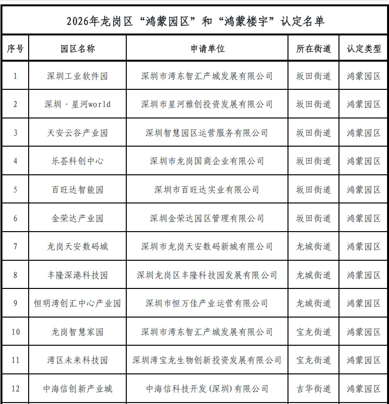 深圳市龙岗区工业和信息化局关于发布2026年龙岗区“鸿蒙园区”和“鸿蒙楼宇”认定名单的公告