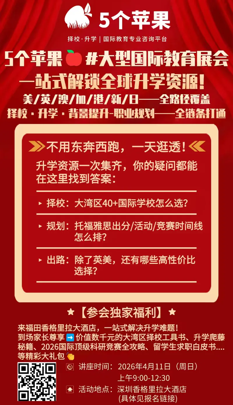 报名时间:2026年4月3日 - 2026年4月21日*报名后,学校会以邮件形式通知具体考试时间安排,家长们要注意确认。想要第一时间了解南山中英文学校招生政策、开放日、入学考等相关资讯的学生及家长可以扫描下方二维码,我们安排专业顾问为您提供1V1咨询服务。2026年9月