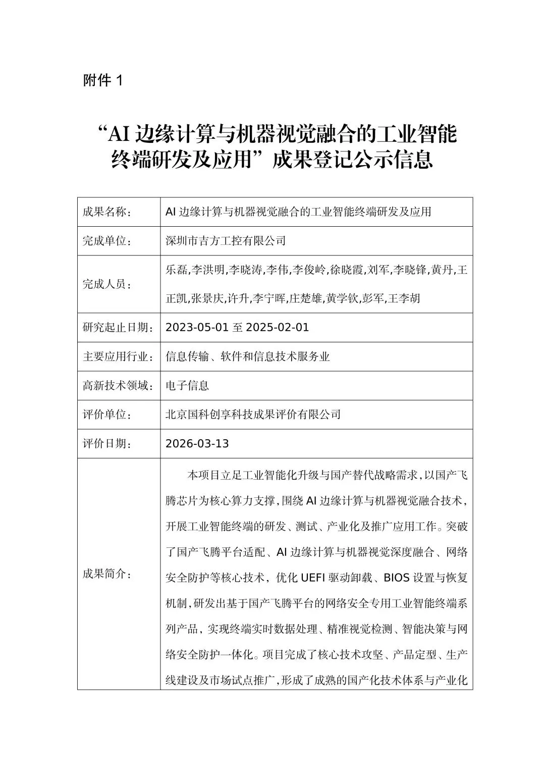 1.“AI边缘计算与机器视觉融合的工业智能终端研发及应用”成果登记公示信息