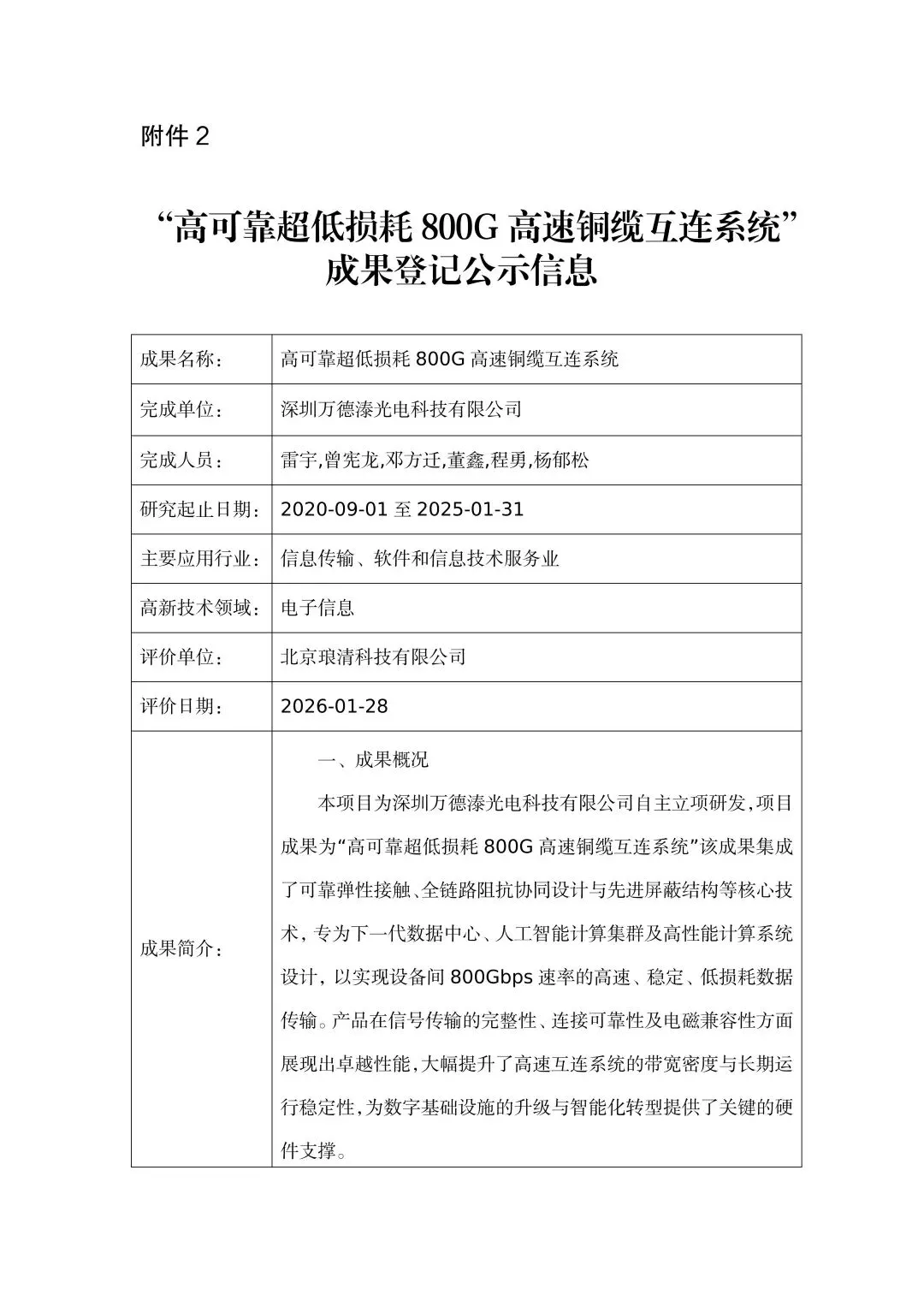2.“高可靠超低损耗800G高速铜缆互连系统”成果登记公示信息