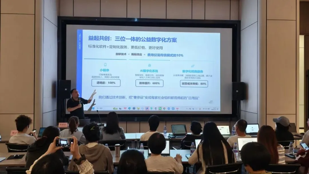 随后,来自深圳市南山区益起共创公益服务中心的杨志成围绕 “益起共创 × WorkBuddy” 的结合实践,系统介绍了公益数字化在真实业务场景中的落地路径。他从机构服务实际出发,重点分享了如何通过数字化系统连接捐赠人、志愿者、受益人及项目执行流程,将过去分散在个人电脑和线下环节中的工作,逐步沉淀为可协同、可追踪、可复用的数据资产。在此基础上,借助 AI 能力进一步提升项目管理、反馈处理、内容生成和流程协作效率,推动公益工作从“结果记录”走向“过程管理”。他结合助学、社区服务等案例说明,数字化不仅提升了执行效率和透明度,也为筹款协同、监管对接和组织服务能力建设提供了更坚实的支撑,展现出“WorkBuddy” AI工具在公益场景中的实践价值。