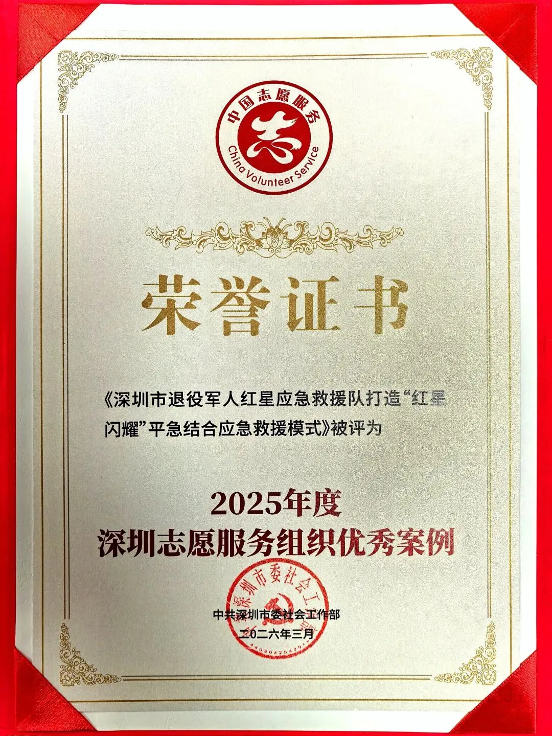 《深圳市退役军人红星应急救援队打造的“红星闪耀·平战结合”应急救援服务模式》,被深圳市委社会工作部评为“2025年度深圳市志愿服务组织优秀案例”,充分体现了市委社会工作部对队伍志愿服务工作的高度认可。