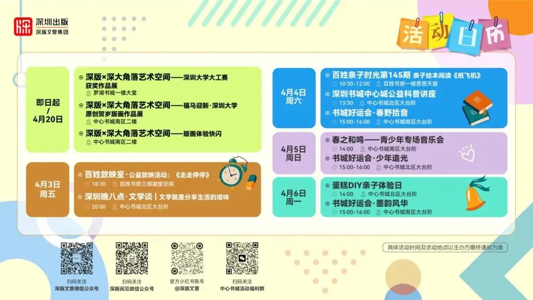 作为深圳全民阅读核心阵地,深圳出版集团旗下各大书城立足市民假期文化生活需求,差异化打造特色主题活动,让市民在“家门口”就能邂逅春日书香。