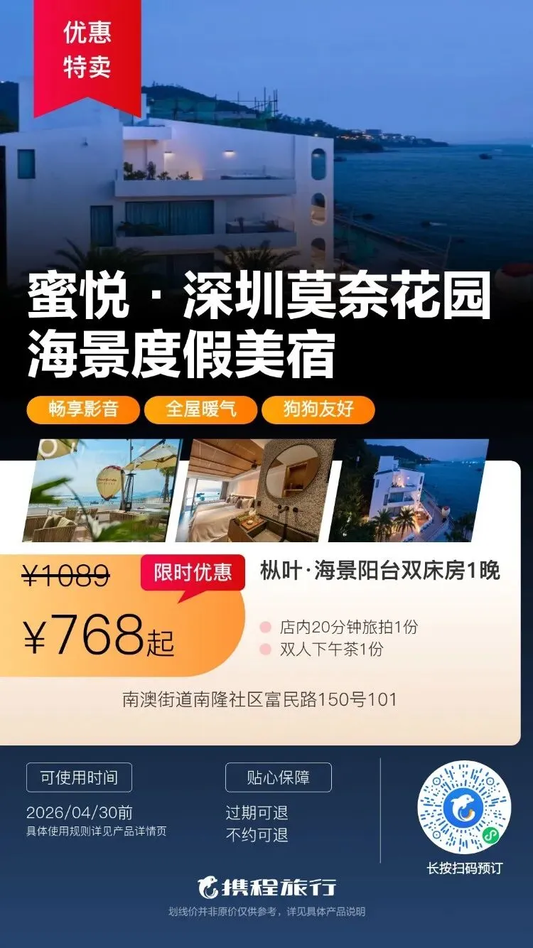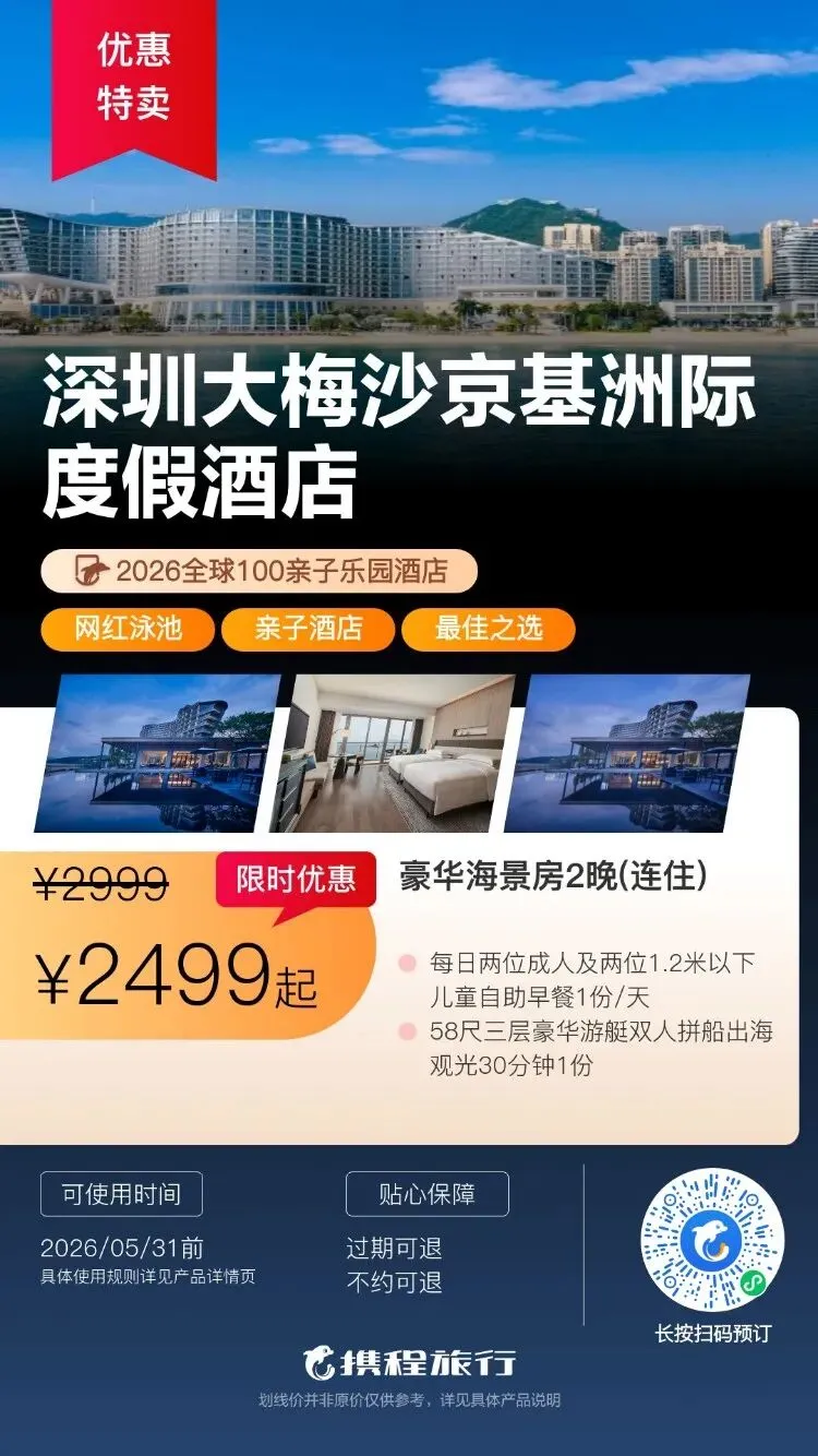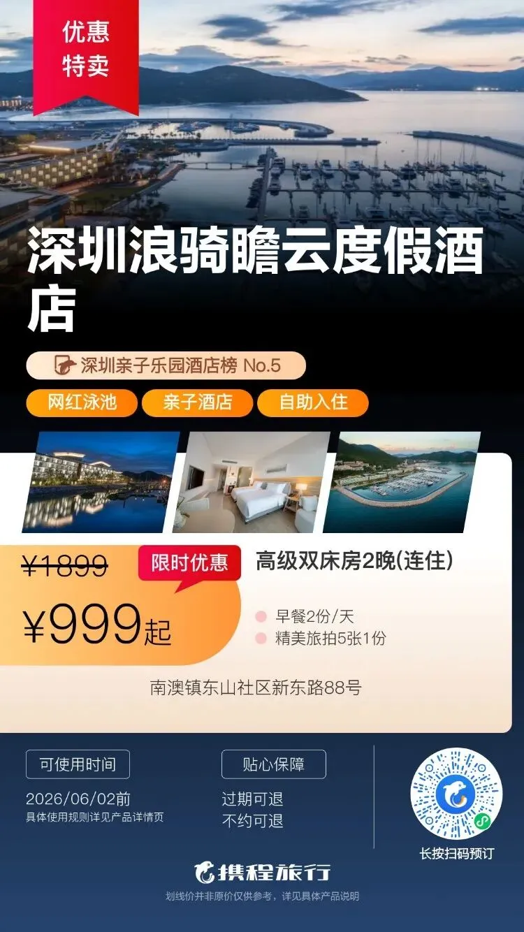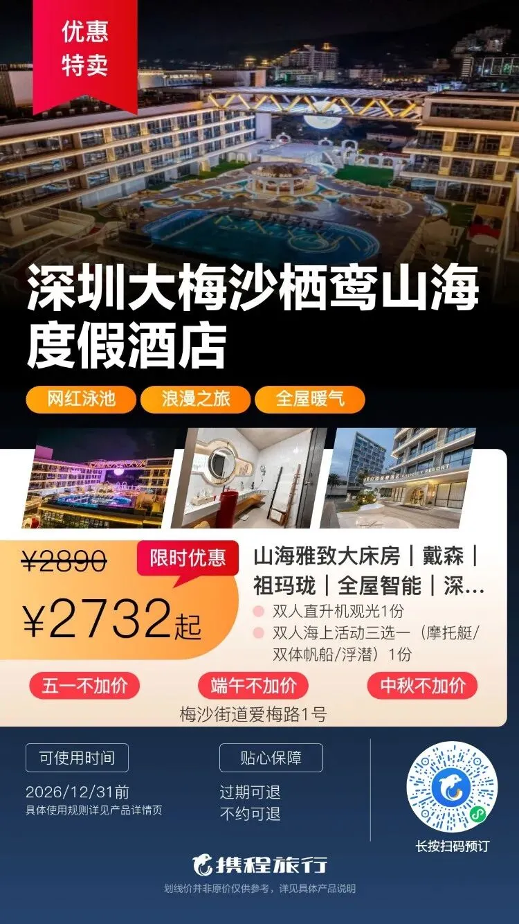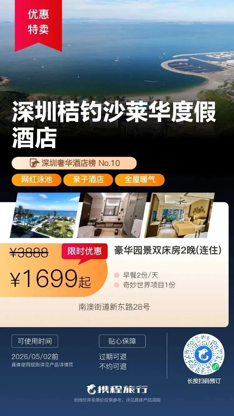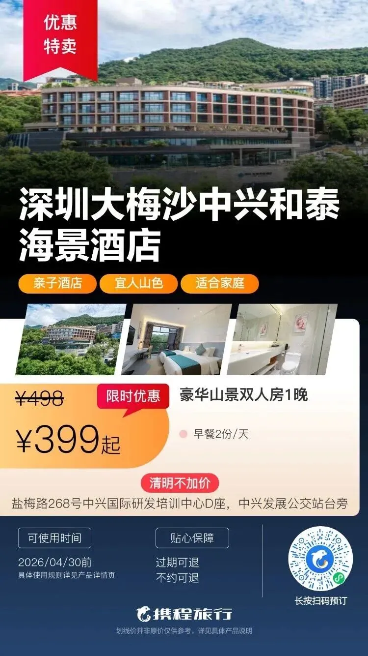 【清明特惠】深圳大梅沙·中兴和泰海景酒店1晚度假+泳池、大梅沙沙滩