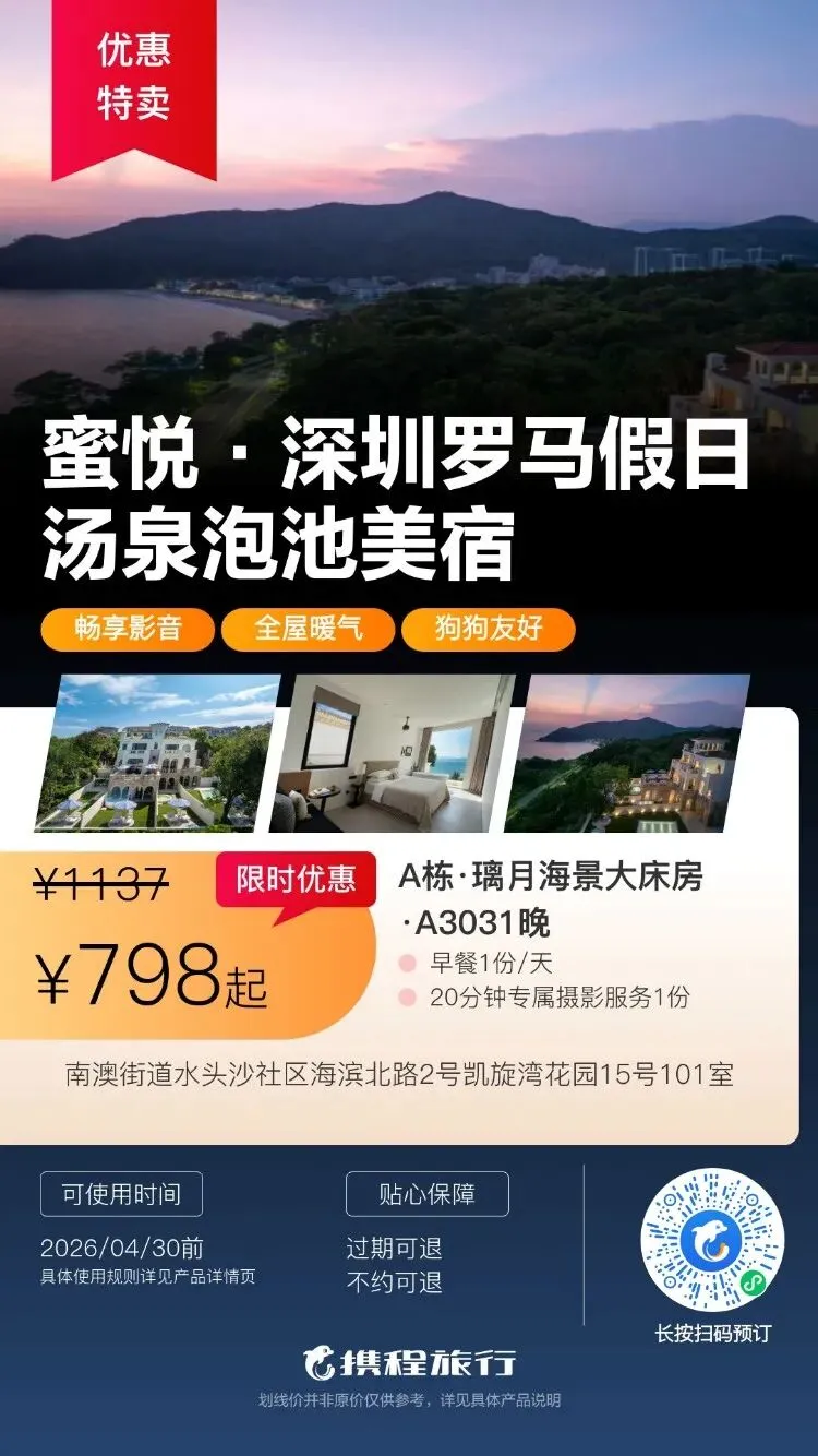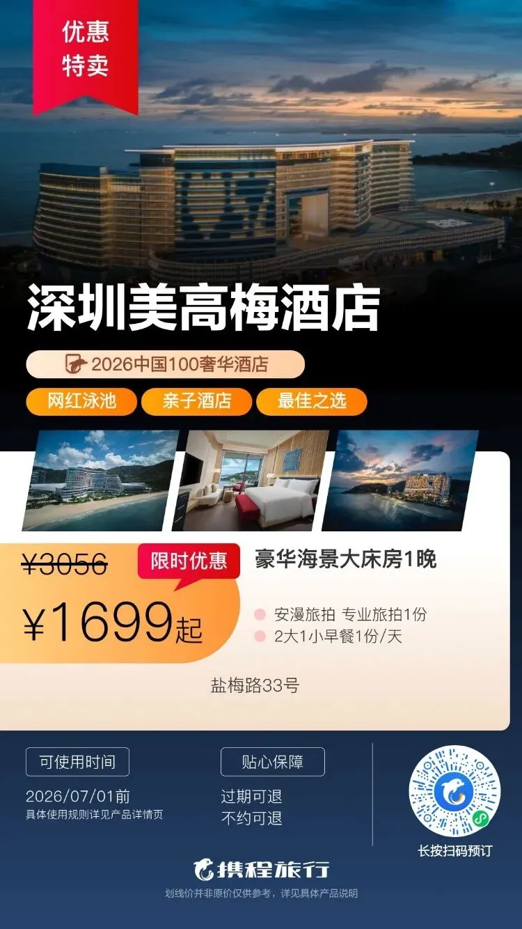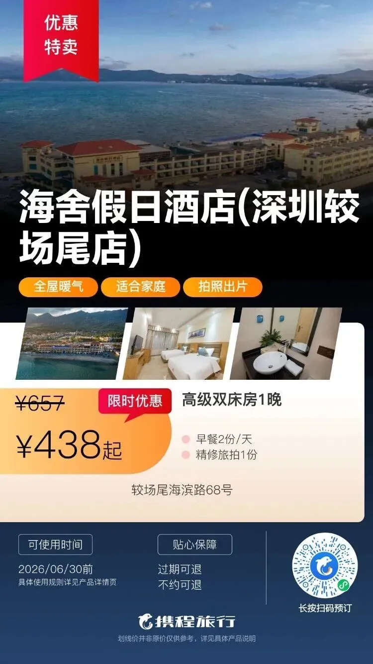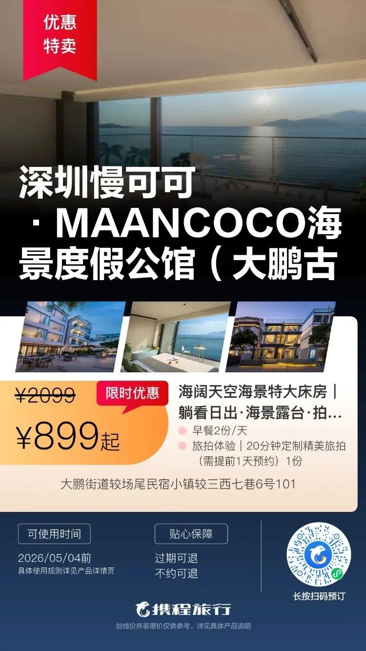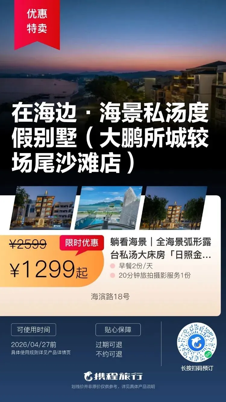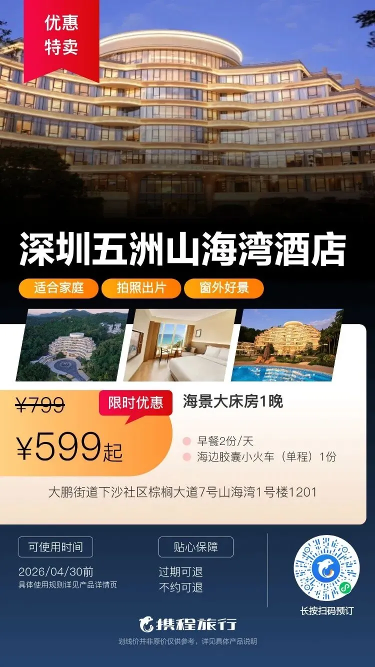 【清明特惠】深圳大梅沙·中兴和泰海景酒店1晚度假+泳池、大梅沙沙滩