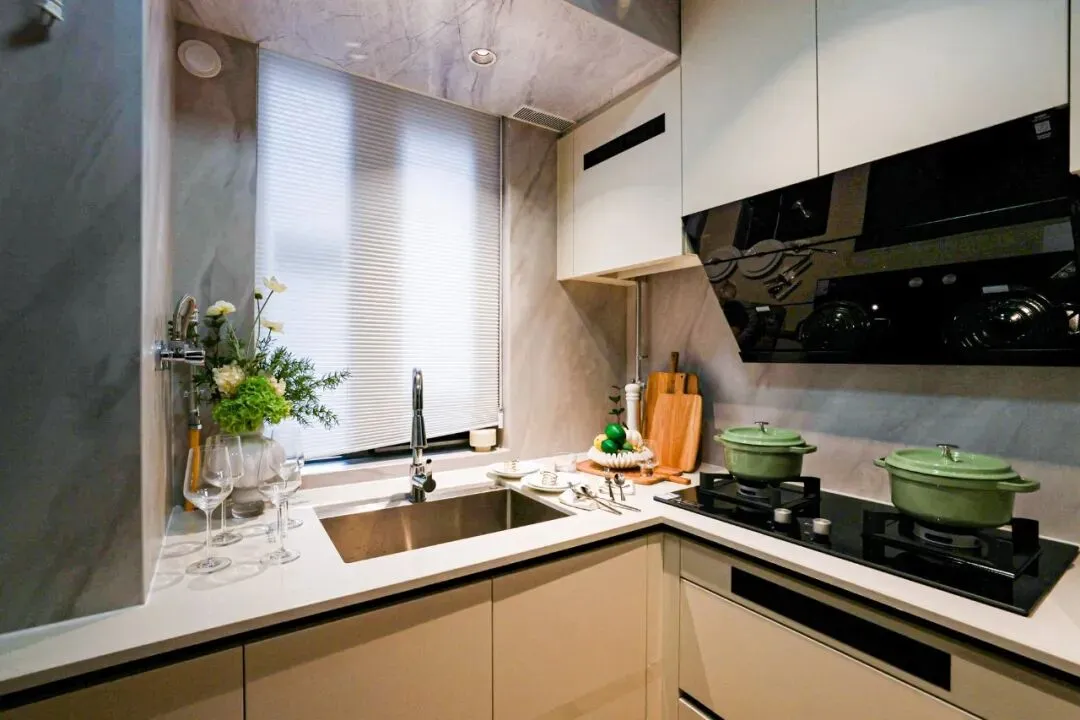 开间达到约3.55米,连接景观阳台;灵动的U型厨房,让洗切烹炒一气呵成;卫生间也做到三段式的干湿分离,即便是高峰使用期,也能便捷从容。