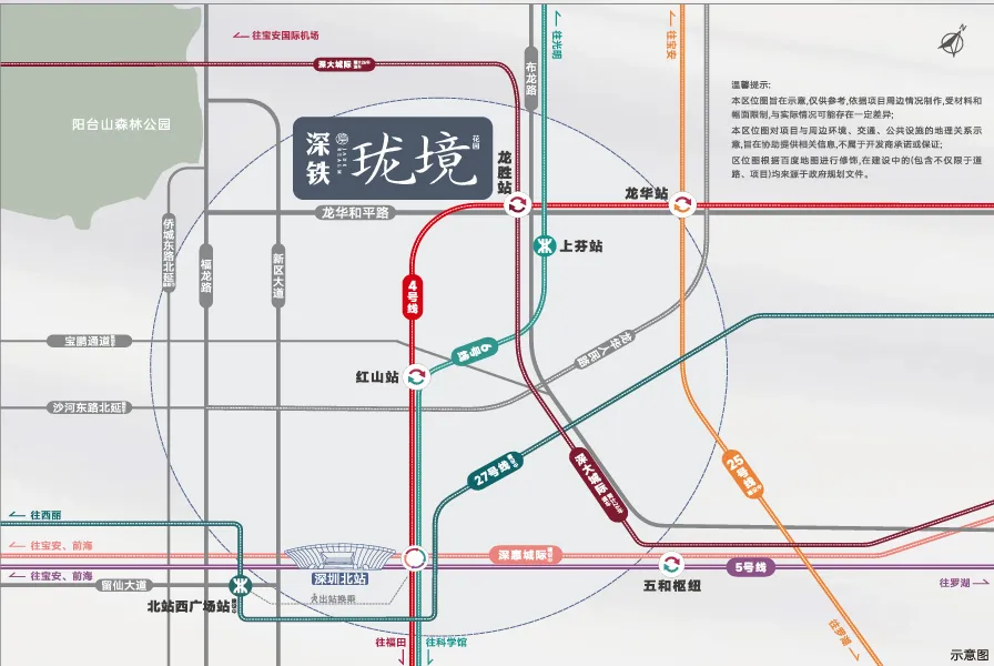 从交通上看,项目近距离就是4/6号线和在建33号线(深大城际)三轨交汇,其中4号线龙胜站更是步行即达。到深圳北站、福田CBD等其他核心区,都十分便捷。
