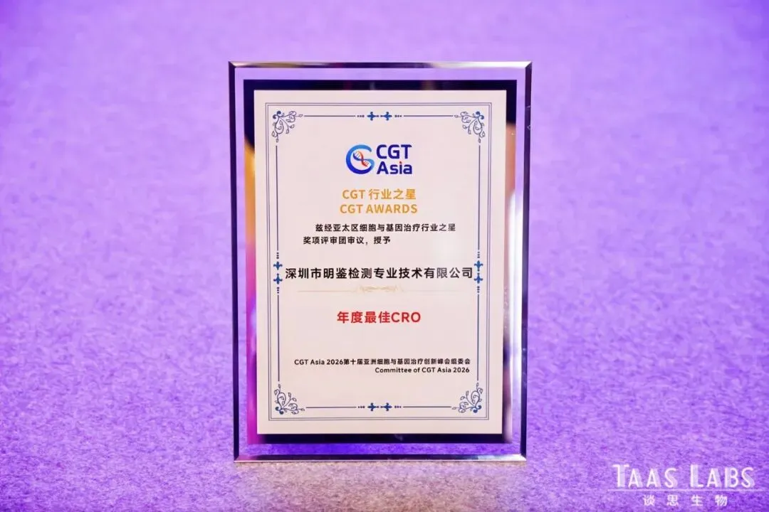 深圳明鉴受邀出席本次峰会,并凭借在产业链服务领域的突出实力与行业影响力,荣获CGT行业之星 “年度最佳 CRO” 奖项。