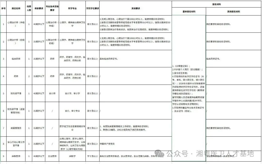 二、招聘条件(一)遵守中华人民共和国宪法和法律,无违规违纪等不良记录。(二)具有良好的政治素质和道德品行,热爱卫生事业。(三)身心健康,具有履行岗位职责所需的业务水平,能胜任所聘岗位要求。(四)符合《招聘岗位表》规定的资格条件且所提供的报名材料真实完整。三、薪酬待遇按《医院编外聘用人员薪酬方案》有关规定执行。四、招聘程序(一)报名。1.报名时间:公告发布之日起至2026年4月6日止。2.报名方式:请应聘人员下载并填写《应聘登记表》(附件2)、个人简历(建议模板)(附件3),将应聘登记表、个人简历及其他报名材料打包发送至邮箱rsb@skh.net,邮件主题格式为“应聘岗位名称+姓名”。各岗位报名材料要求见《招聘岗位表》(附件1)。(二)资格初审。符合招聘条件且报名材料真实、准确、完整的,资格初审通过。经审核不符合招聘岗位要求,或提交的报名信息和材料不全、不实的,资格初审不予通过。(三)面试。在通过资格初审的应聘人员中择优确定入围面试人选,有关面试的具体通知将以电话或短信形式通知,未入围面试的人员不另行通知。(四)体检。在面试成绩合格线以上的人员中按照面试成绩由高到低的顺序与拟聘人数确定拟聘人员。拟聘人员办理入职前需按要求进行体检,不按时参加体检或体检不合格者,取消拟聘资格。体检相关事项另行通知。(五)资格复审及聘用。办理入职前人力资源部将对拟聘人员进行资格复审,资格复审不通过的,取消拟聘资格。资格复审通过的,可办理聘用手续。五、其他注意事项(一)应聘人员需严格按照招聘岗位要求报名,每人限报一个岗位。(二)应聘人员应诚信报名,资格审查贯穿招聘工作全过程,在招录各环节发现应聘人员不符合报考资格条件的,或提交的报名信息和材料不完整或弄虚作假的,取消应聘人员报名资格或者聘用资格。(三)应聘人员应保持电话畅通,因联系信息错误或电话联系不畅造成无法联系本人的,视为自动放弃应聘资格。(四)年龄时间界限计算至2026年3月31日止。(五)2026年应届毕业生须于办理入职前达到岗位要求并取得岗位要求的相关证书。如不符合岗位要求或不能提供相关证书原件,取消聘用资格。六、联系方式联系电话:0755-84622114、25603443联系人:吴老师联系地址:深圳市坪山区振碧路77号深圳市康宁医院(坪山院区)行政中心504室人力资源部点击阅读原文下载附件:附件1:招聘岗位表附件2:应聘登记表(应聘岗位-姓名)附件3:个人简历(建议模版)