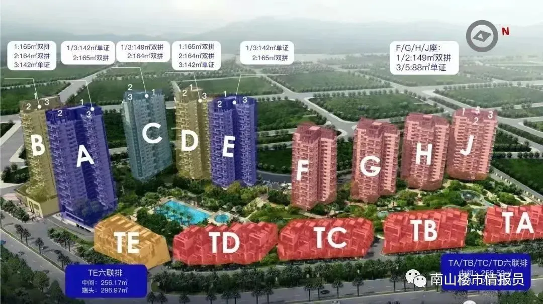 小区一共9栋高层:ABCDE 5栋,二梯三户,总层高24层;FGHJ 4栋,二梯四户,总层高18层;高层主要户型89㎡2+1房,142-165㎡的4-5房,256~300㎡顶层复式,户户均有入户花园,部分双证,部分单证,分错层结构;整个小区的布局朝东南,70%的单位都可以无遮挡看海景。30套别墅(TA、TB、TC、TD、TE 5栋,每栋6户)为面积约258㎡上下5层的联排别墅。