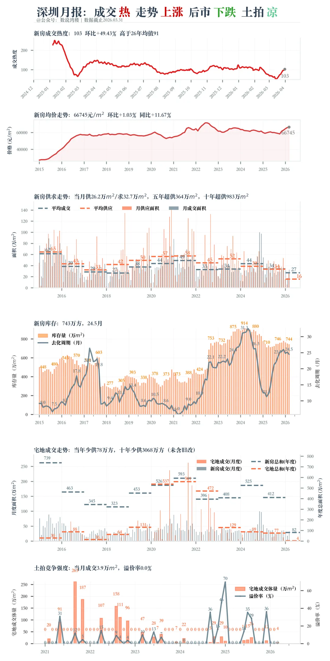 3月深圳新房供应26.2万㎡,成交32.7万㎡,当月供小于求。从中期维度看,近五年深圳市场超供364万㎡,近十年超供983万㎡,历史供应余量仍在持续消化;但2023年以来,宅地成交规模持续低于新房成交,市场正在通过“少供地(成交)、去库存”修复楼市健康度,供需格局亦在逐步优化。