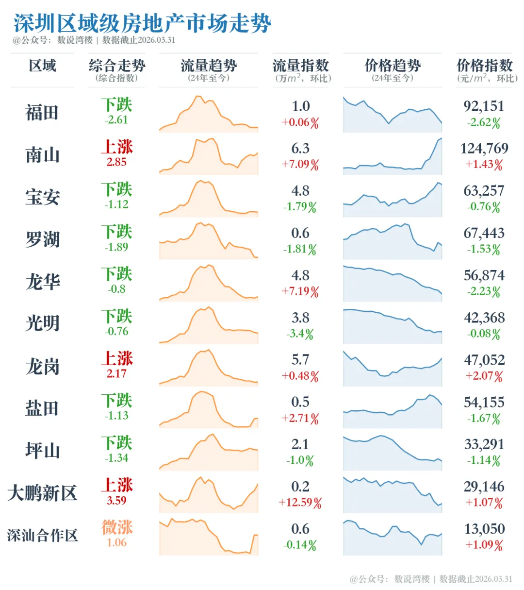 从深圳11个行政区的表现来看,市场呈现“局部上涨、普遍承压”的格局:仅南山、龙岗、大鹏新区 3 个区域实现综合走势上涨,其余 8 个区域均为下跌,仅深汕合作区微涨,多数区域仍未走出调整周期。