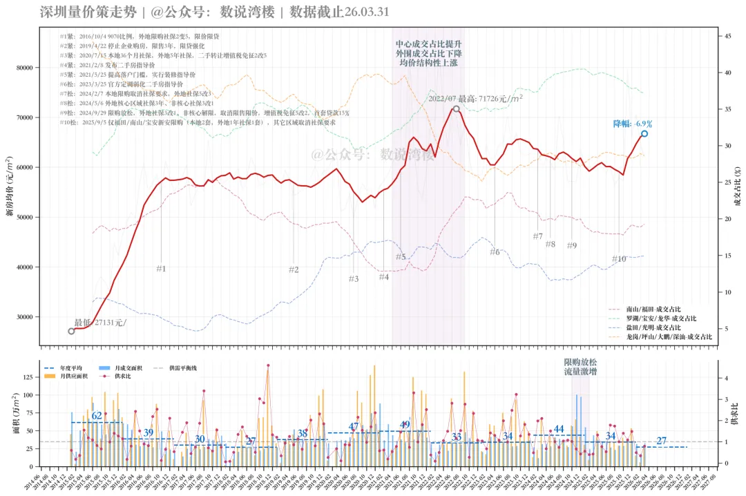 2022年7月,深圳均价触及71726元/㎡的历史高点,随后在政策调整影响下持续回调,库存持续走高,市场连锁反应。月度成交量在政策密集年可小幅释放,但后续则逐步走低。
