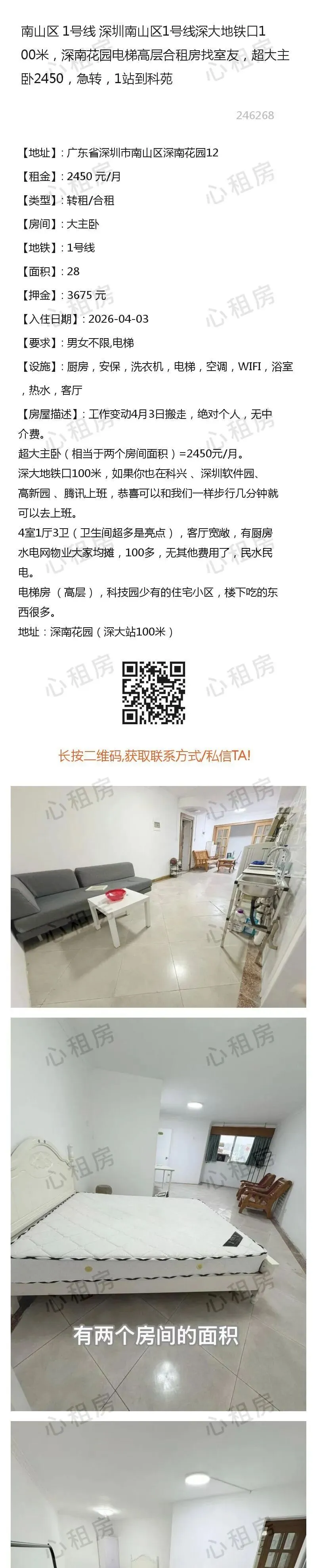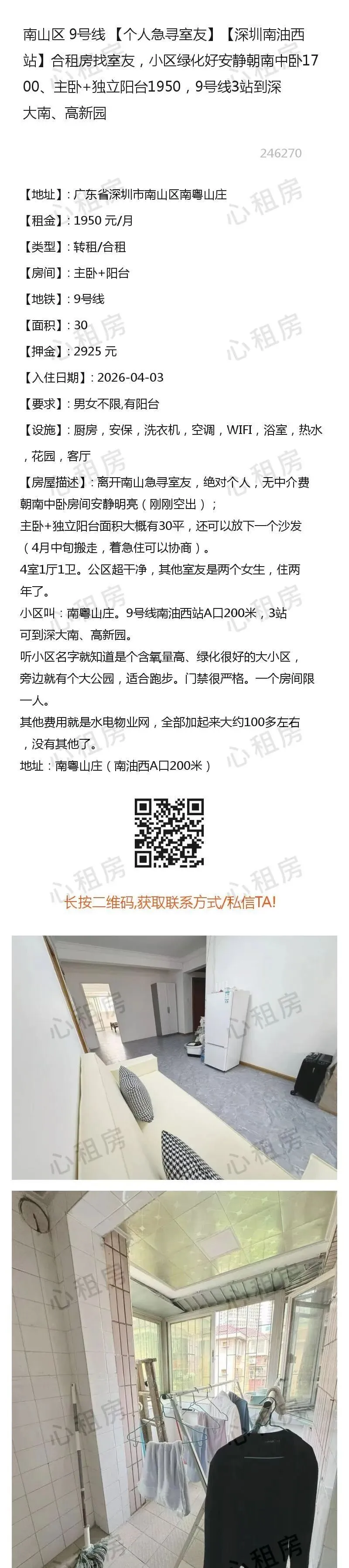 深圳租房黑房东找房子罗湖合找室友合租短租深租房科技园深大豆瓣南山租房地铁租房龙华新福田罗湖光明新区坪山新区大鹏南山豆瓣1、所有房源信息均由网友投稿,委托本公众号/心租房(homhere.cn)发布,房源的真实性、合法性由提供者负责。2、请务必核实双方身份信息(身份证)、房产权属(产权证明)、转租权利(租赁合同)等基本信息。3、请务必实地考察房源并确保与出租方提供的基本信息一致。4、切勿轻易支付定金、保证金、打赏等,建议签订《租赁合同》后再进行交易。5、双方在房屋租赁过程中产生的一切纠纷,均与本公众号/心租房(homhere.cn)无关。6、近期欺诈团伙在境外以相亲交友、租房、国际包裹等名义实施杀猪盘、诱导下载未知app等进行刷单返利等欺诈的行为较多,请先确认对方身份,保护个人隐私和财产安全。