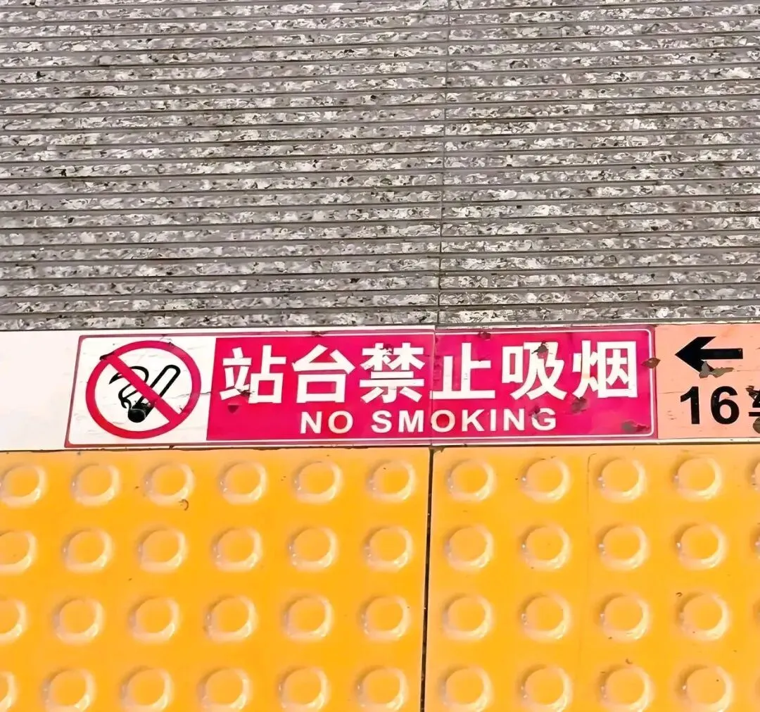 - 标识全覆盖:站台地面、立柱、大屏全是禁烟标识,连电子烟符号都印上了;