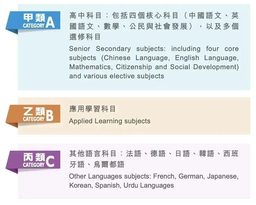 甲类(A):高中科目:包括四个核心科目(中文、英文、数学、公民与社会发展,以及多个选修科目);
