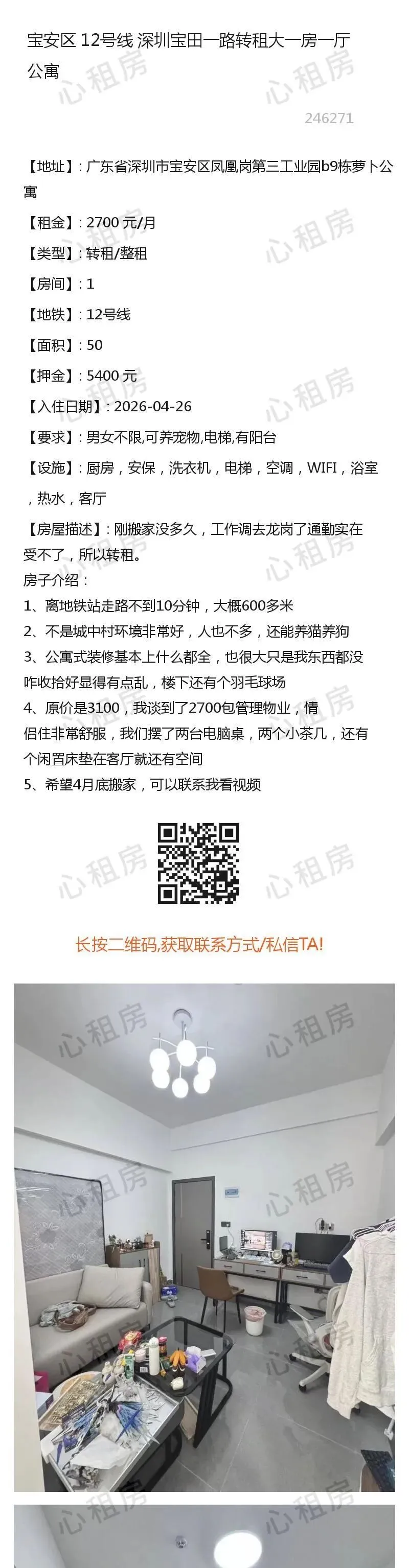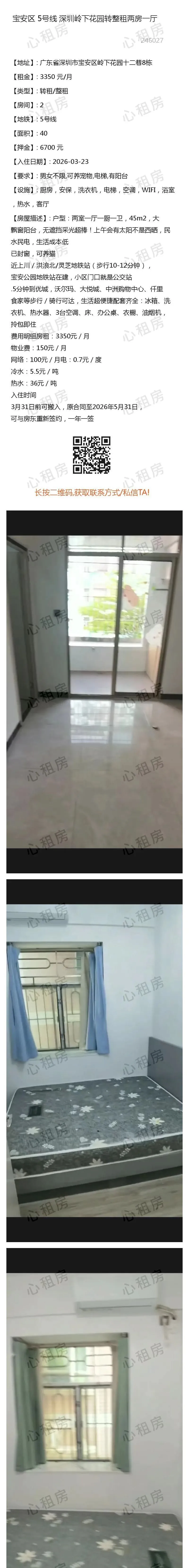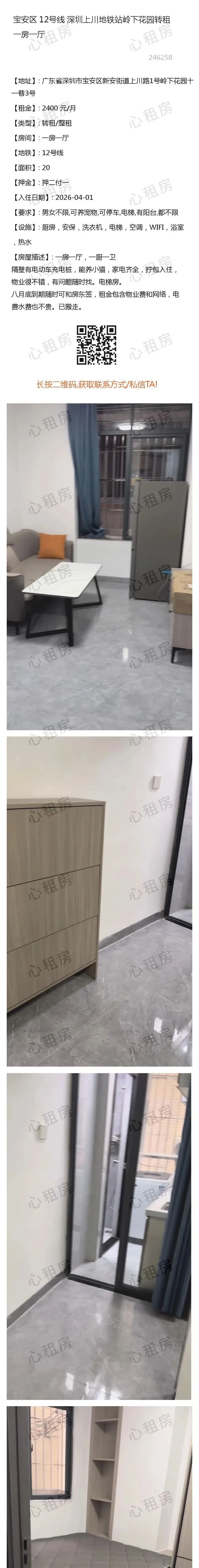 深圳租房【宝安4则】房源①:12号线深圳宝安上川地铁站岭下花园转租一房一厅2400元/月;房源②:…