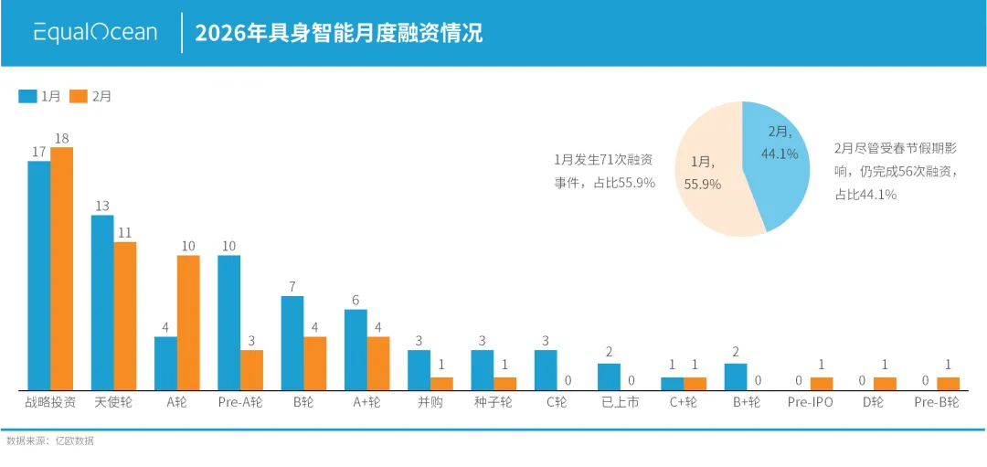 从融资时间分布看,1月发生71次融资事件,占比55.9%;2月尽管受春节假期影响,仍完成56次融资,占比44.1%。