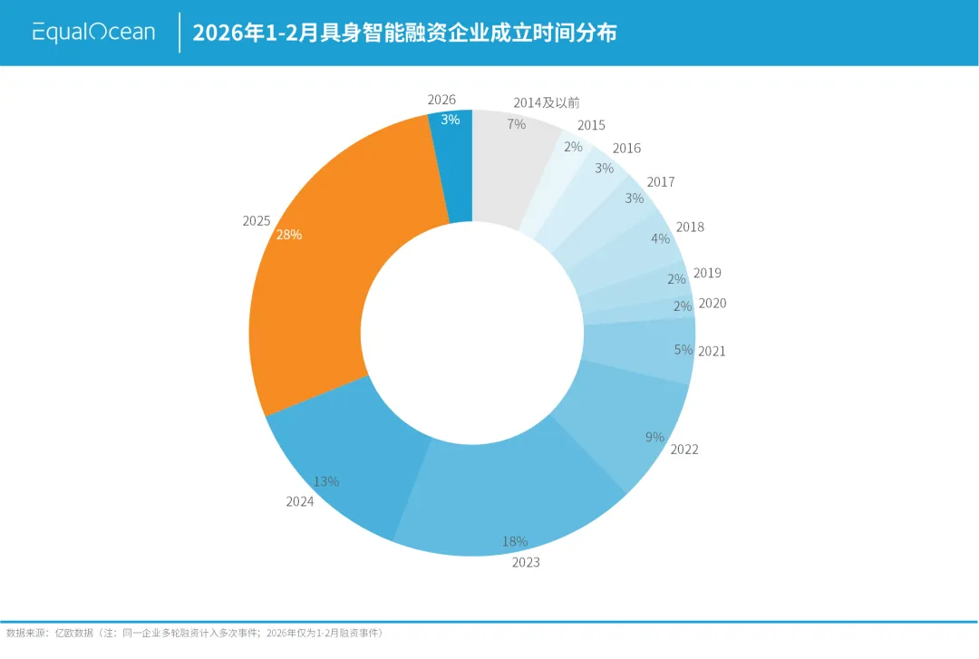 从企业成立时间来看,具身智能赛道呈现高度年轻化特征:2023-2026年2月成立的企业占比达62%,成立于2025年的初创企业更是以28%的占比位居首位。资本正高度聚焦早期创业公司,新玩家持续涌入,行业仍处于技术迭代与商业化探索的快速扩张阶段。