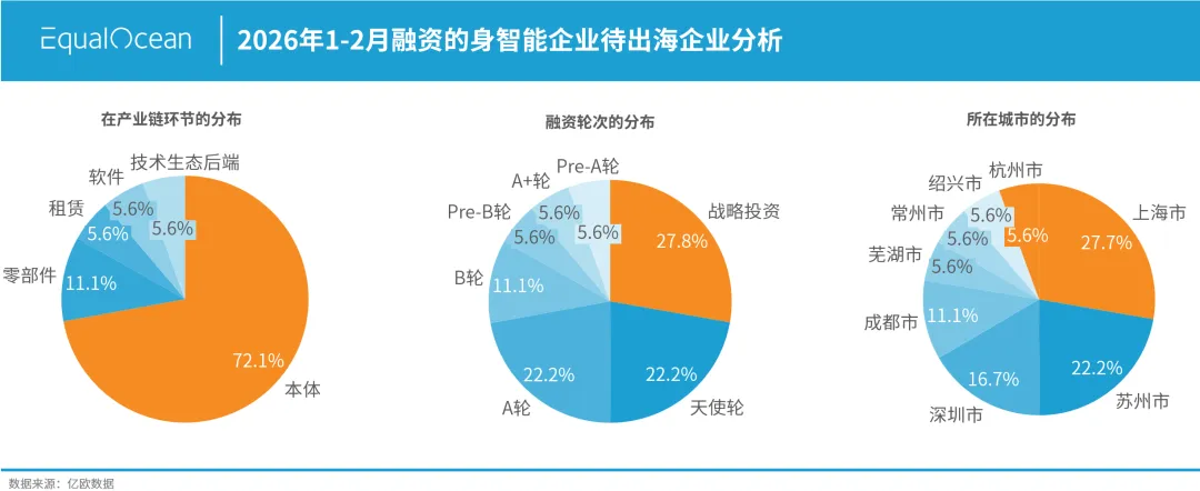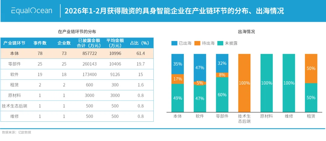 从产业链环节看,本体类企业以78次融资(占比61.4%)占据绝对主导地位,零部件类25次(19.7%),软件类19次(15%),租赁、原材料、维修、技术生态后端合计5次(3.9%)。但一个值得关注的结构性变化是:软件类企业虽然融资数量仅19次,但其出海率高达47.4%(9家已出海),远高于本体类的34.6%(27家)和零部件类的32%(8家)。
