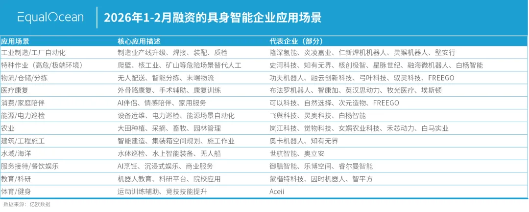 融资覆盖的应用场景中,工业制造、特种作业、物流仓储这类场景的共同特点是替代性强、容错空间大,不需要机器人做到完美,只需要比人更稳、更便宜、更耐用。消费陪伴、农业、建筑等长尾场景也已有企业布局,但多处于早期验证,尚未形成规模融资。