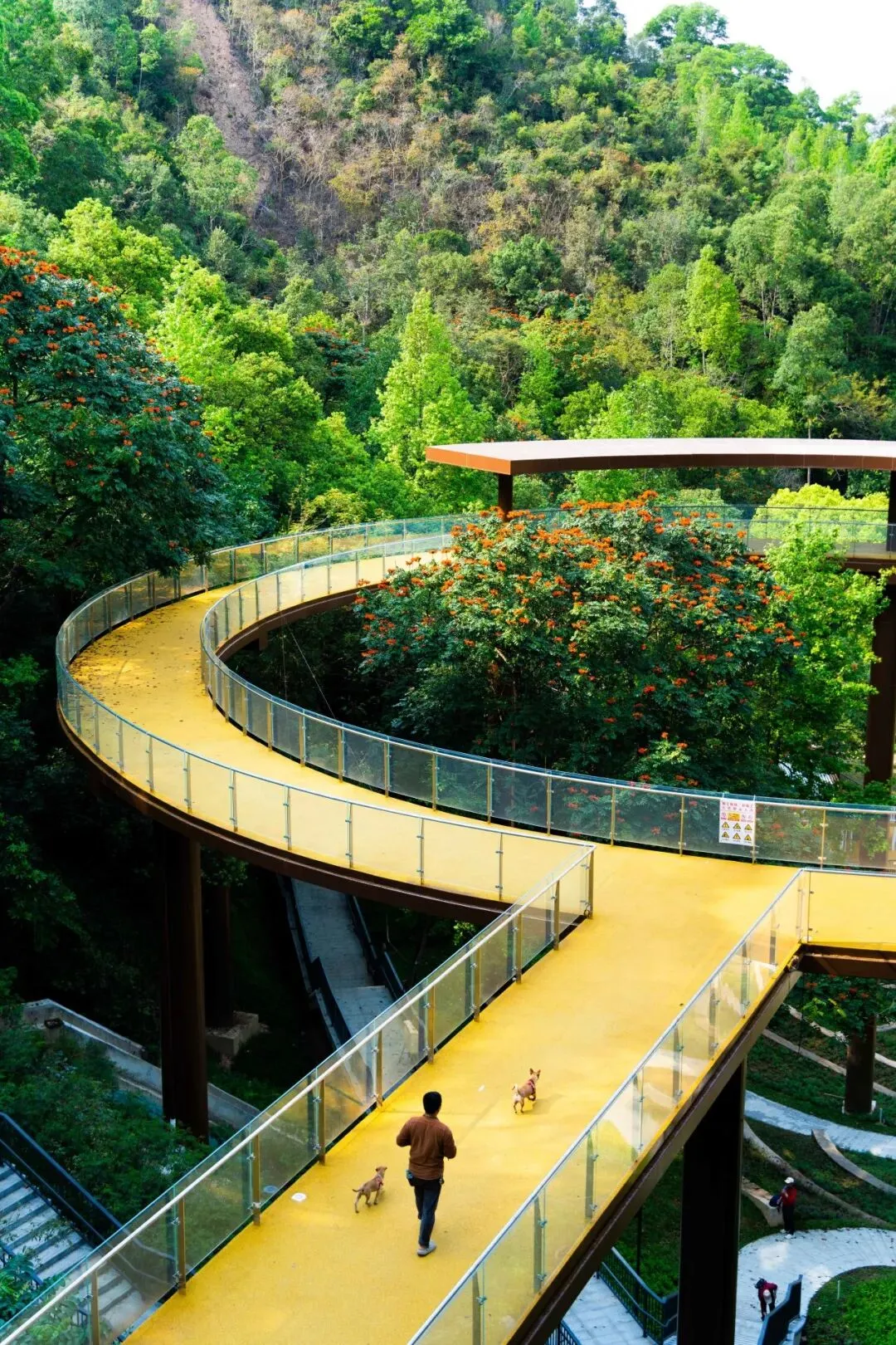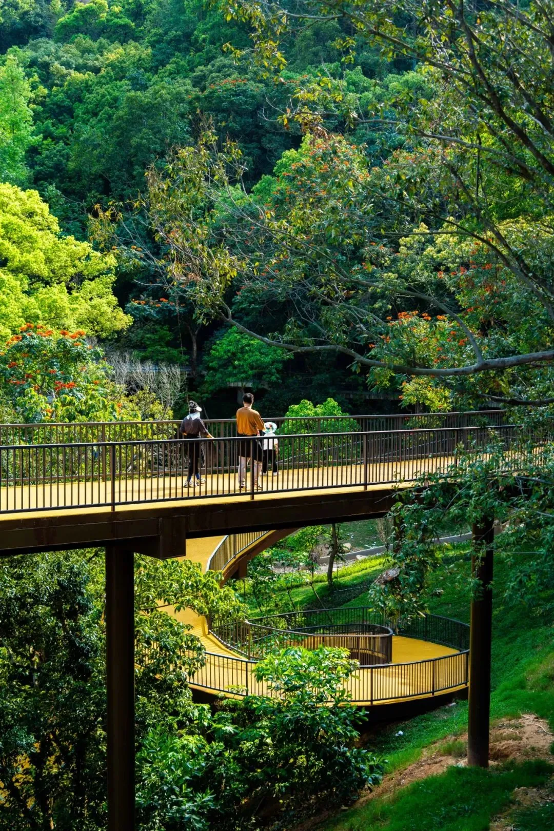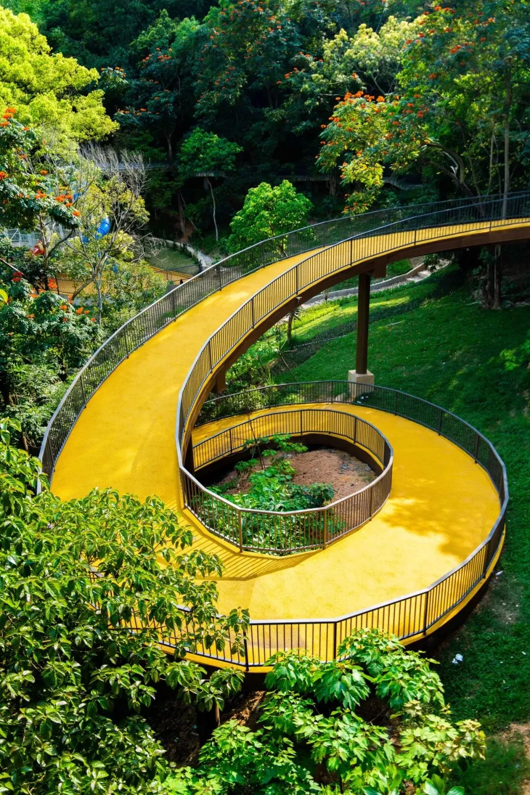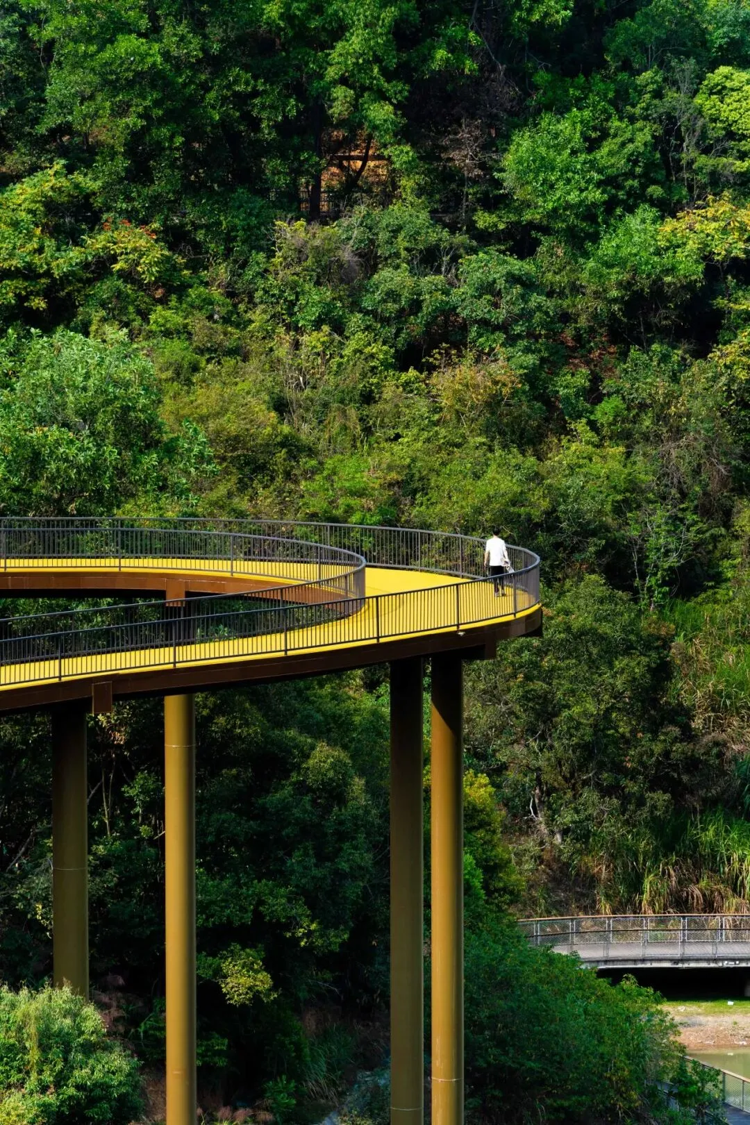 公园里最引人注目的,莫过于这条明黄色的架空环桥,一个巨大的圆环温柔地架在山谷间,仿佛和密林融为一体。